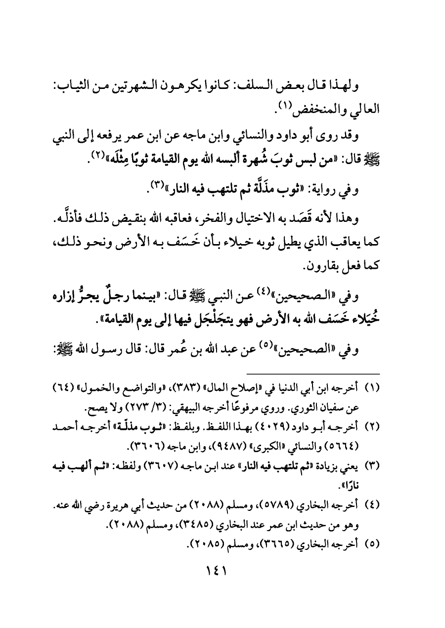 وقد روى أبو داود والنسائي وابن ماجه عن ابن عمر يرفعه إلى النبي - صلى الله عليه وسلم - قال: "من لبس ثوبَ شُهرة ألبسه الله يوم القيامة ثوبًا مِثْلَه" (¬٢).