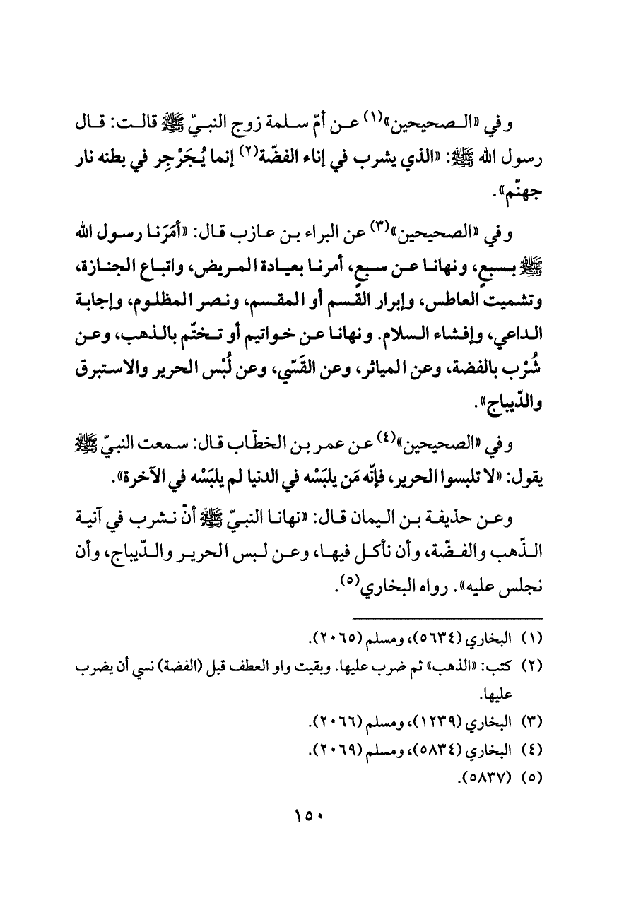 وعن حذيفة بن اليمان قال: "نهانا النبيّ - صلى الله عليه وسلم - أنّ نشرب في آنية الذّهب والفضّة، وأن نأكل فيها، وعن لبس الحرير والدّيباج، وأن نجلس عليه". رواه البخاري (¬٥).