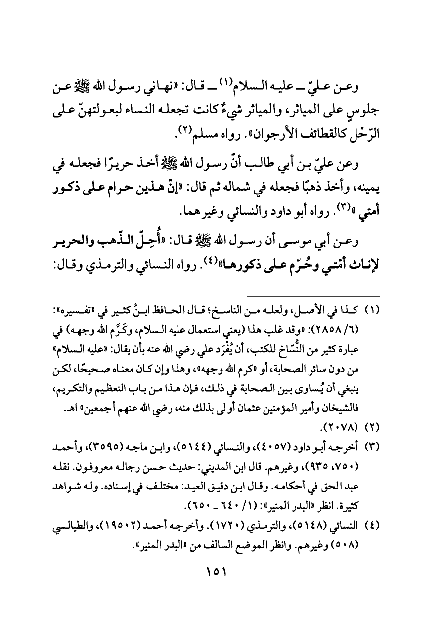 وعن عليّ بن أبي طالب أنّ رسول الله - صلى الله عليه وسلم - أخذ حريرًا فجعله في يمينه، وأخذ ذهبًا فجعله في شماله ثم قال: "إنّ هذين حرام على ذكور أمتي " (¬٣). رواه أبو داود والنسائي وغيرهما.