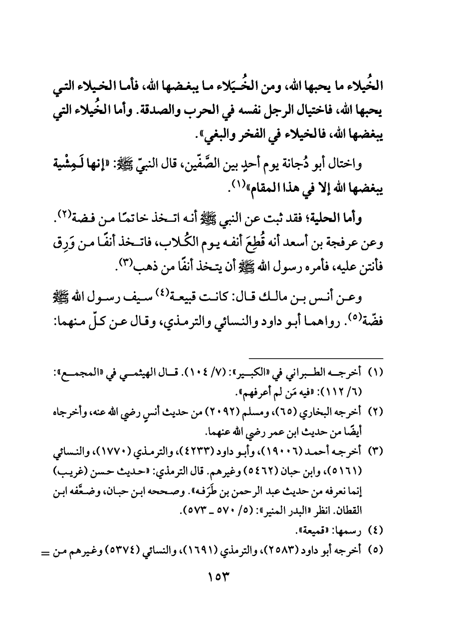وعن أنس بن مالك قال: كانت قبيعة (¬٤) سيف رسول الله - صلى الله عليه وسلم - فضّة (¬٥). رواهما أبو داود والنسائي والترمذي، وقال عن كلّ منهما: