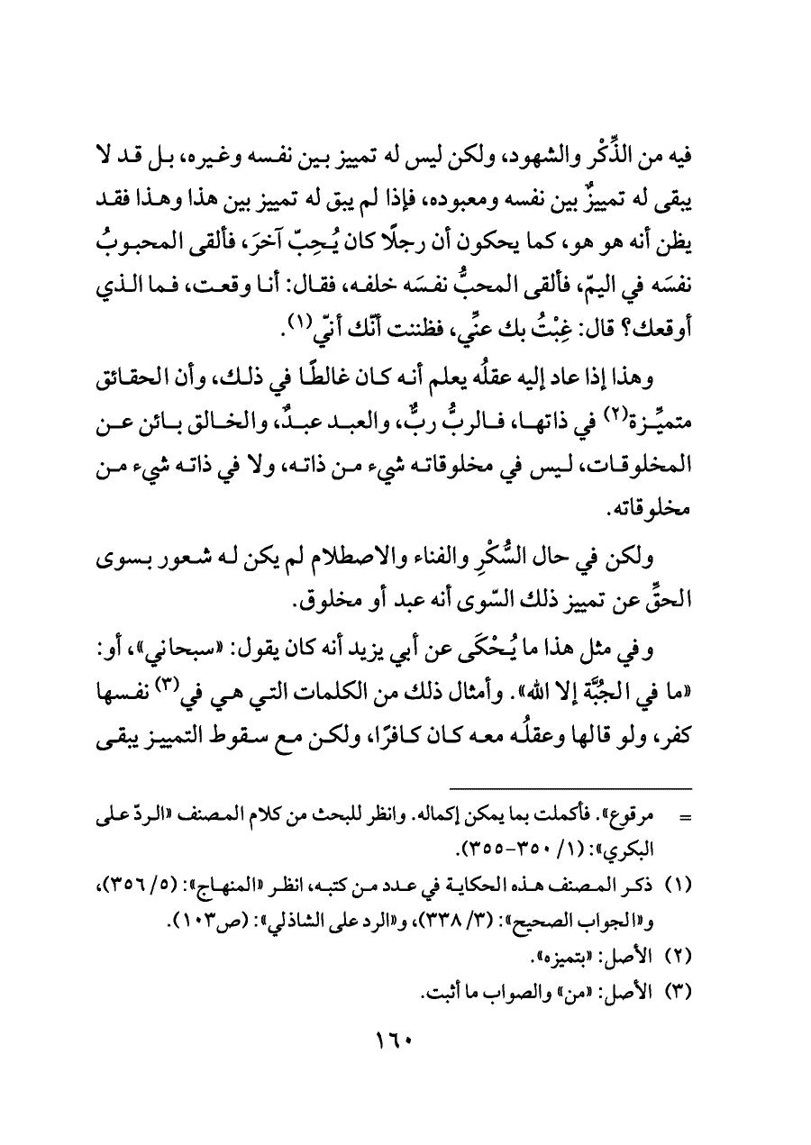 ولكن في حال السُّكْرِ والفناء والاصطلام لم يكن له شعور بسوى الحقِّ عن تمييز ذلك السّوى أنه عبد أو مخلوق.