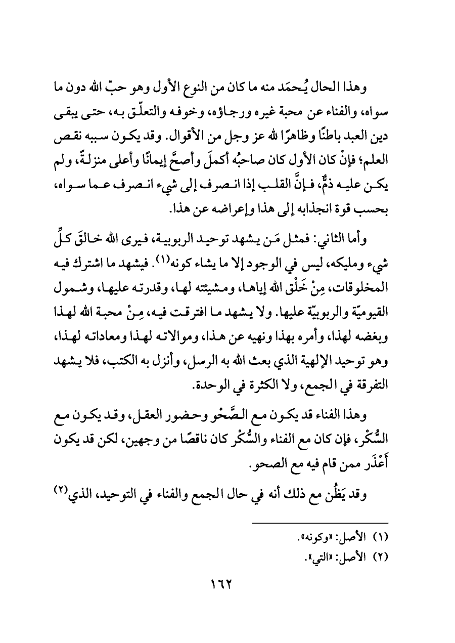 وهذا الفناء قد يكون مع الصَّحْو وحضور العقل، وقد يكون مع السُّكْر، فإن كان مع الفناء والسُّكْر كان ناقصًا من وجهين، لكن قد يكون أَعْذَر ممن قام فيه مع الصحو.