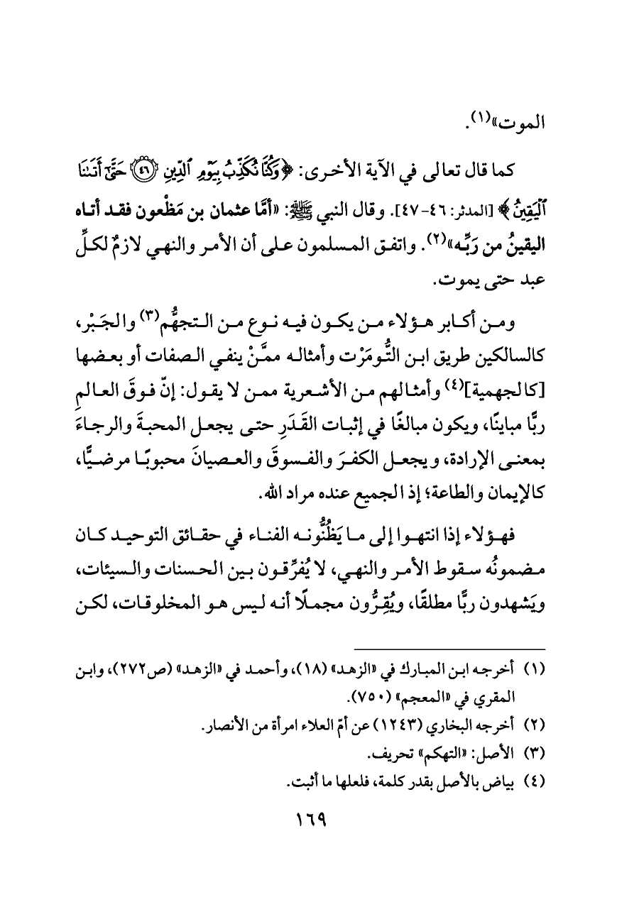 كما قال تعالى في الآية الأخرى: {وَكُنَّا نُكَذِّبُ بِيَوْمِ الدِّينِ (٤٦) حَتَّى أَتَانَا الْيَقِينُ} [المدثر: ٤٧ - ٤٨]. وقال النبي - صلى الله عليه وسلم -: "أمَّا عثمان بن مَظْعون فقد أتاه اليقينُ من رَبِّه" (¬٢). واتفق المسلمون على أن الأمر والنهي لازمٌ لكلِّ عبد حتى يموت.