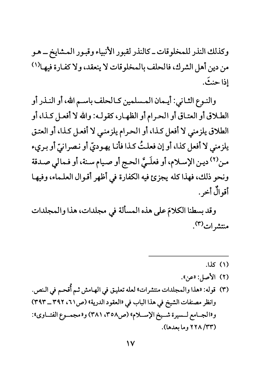 والنوع الثاني: أيمان المسلمين كالحلف باسم الله، أو النذر أو الطلاق أو العتاق أو الحرام أو الظهار، كقوله: والله لا أفعل كذا، أو الطلاق يلزمني لا أفعل كذا، أو الحرام يلزمني لا أفعل كذا، أو العتق يلزمني لا أفعل كذا، أو إن فعلتُ كذا فأنا يهوديّ أو نصرانيّ أو بريء من (¬٢) دين الإسلام، أو فعلَيَّ الحج أو صيام سنة، أو فمالي صدقة ونحو ذلك، فهذا كله يجزئ فيه الكفارة في أظهر أقوال العلماء، وفيها أقوالٌ أخر.