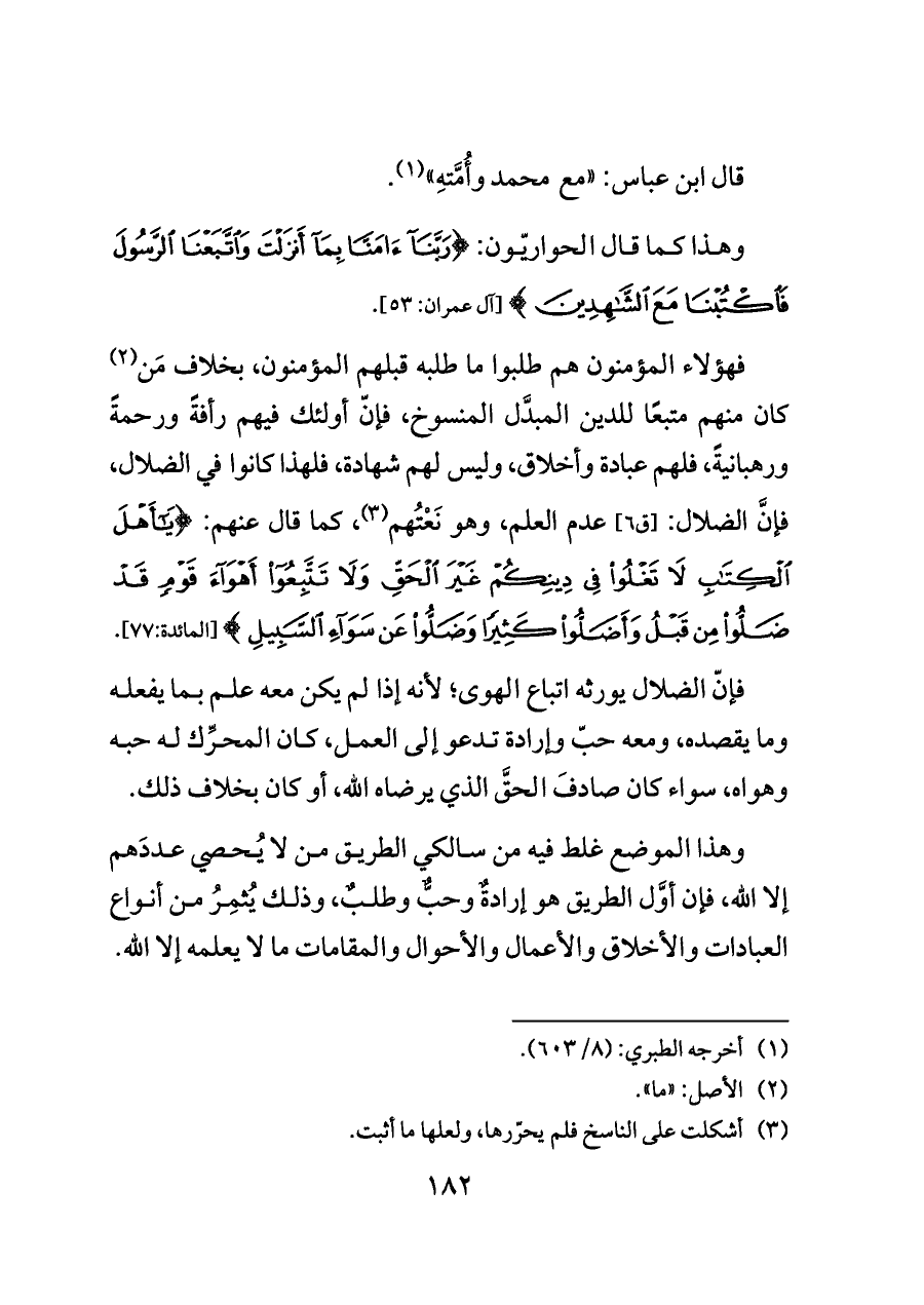 فهؤلاء المؤمنون هم طلبوا ما طلبه قبلهم المؤمنون، بخلاف مَن (¬٢) كان منهم متبعًا للدين المبدَّل المنسوخ، فإنّ أولئك فيهم رأفةً ورحمةً ورهبانيةً، فلهم عبادة وأخلاق، وليس لهم شهادة، فلهذا كانوا في الضلال، فإنَّ الضلال: [ق ٦] عدم العلم، وهو نَعْتُهم (¬٣)، كما قال عنهم: {يَاأَهْلَ الْكِتَابِ لَا تَغْلُوا فِي دِينِكُمْ غَيْرَ الْحَقِّ وَلَا تَتَّبِعُوا أَهْوَاءَ قَوْمٍ قَدْ ضَلُّوا مِنْ قَبْلُ وَأَضَلُّوا كَثِيرًا وَضَلُّوا عَنْ سَوَاءِ السَّبِيلِ} [المائدة:٧٧].