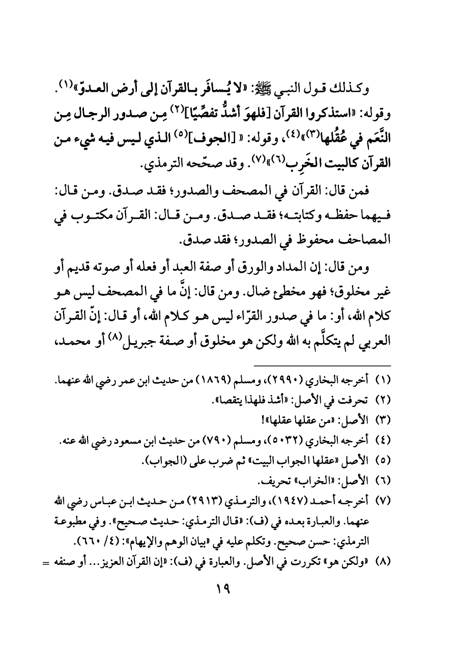 وكذلك قول النبي - صلى الله عليه وسلم -: «لا يُسافَر بالقرآن إلى أرض العدوّ» (¬١). وقوله: «استذكروا القرآن [فلهوَ أشدُّ تفصِّيًا] (¬٢) مِن صدور الرجال مِن النَّعَم في عُقُلها (¬٣)» (¬٤)، وقوله: «[الجوف] (¬٥) الذي ليس فيه شيء من القرآن كالبيت الخَرِب (¬٦)» (¬٧). وقد صحّحه الترمذي.