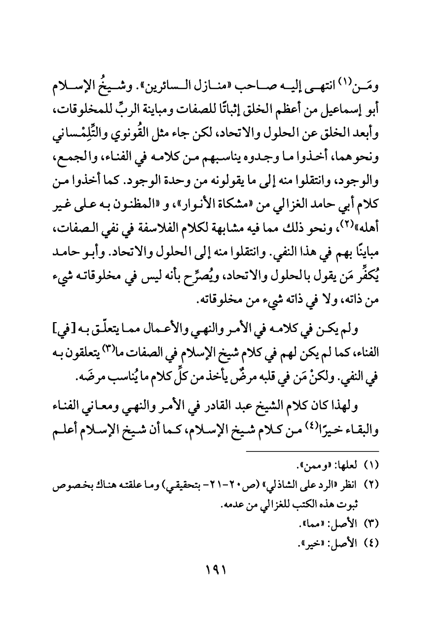 ومَن (¬١) انتهى إليه صاحب "منازل السائرين". وشيخُ الإسلام أبو إسماعيل من أعظم الخلق إثباتًا للصفات ومباينة الربِّ للمخلوقات، وأبعد الخلق عن الحلول والاتحاد، لكن جاء مثل القُونوي والتِّلِمْساني ونحوهما، أخذوا ما وجدوه يناسبهم من كلامه في الفناء، والجمع، والوجود، وانتقلوا منه إلى ما يقولونه من وحدة الوجود. كما أخذوا من كلام أبي حامد الغزالي من "مشكاة الأنوار"، و "المظنون به على غير أهله" (¬٢)، ونحو ذلك مما فيه مشابهة لكلام الفلاسفة في نفي الصفات، مباينًا بهم في هذا النفي. وانتقلوا منه إلى الحلول والاتحاد. وأبو حامد يُكفِّر مَن يقول بالحلول والاتحاد، ويُصرِّح بأنه ليس في مخلوقاته شيء من ذاته، ولا في ذاته شيء من مخلوقاته.