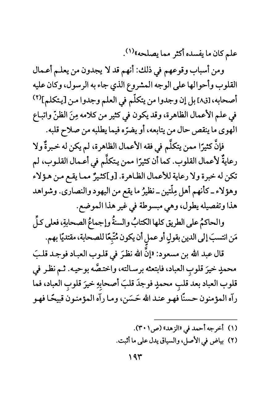 فإنَّ كثيرًا ممن يتكلَّم في فقه الأعمال الظاهرة، لم يكن له خبرةٌ ولا رعايةٌ لأعمال القلوب. كما أن كثيرًا ممن يتكلَّم في أعمال القلوب، لم تكن له خبرة ولا رعاية للأعمال الظاهرة. [و] كثيرٌ مما يقع من هؤلاء وهؤلاء ــ كأنهم أهل مِلّتين ــ نظيرُ ما يقع من اليهود والنصارى. وشواهد هذا وتفصيله يطول، وهي مبسوطة في غير هذا الموضع.