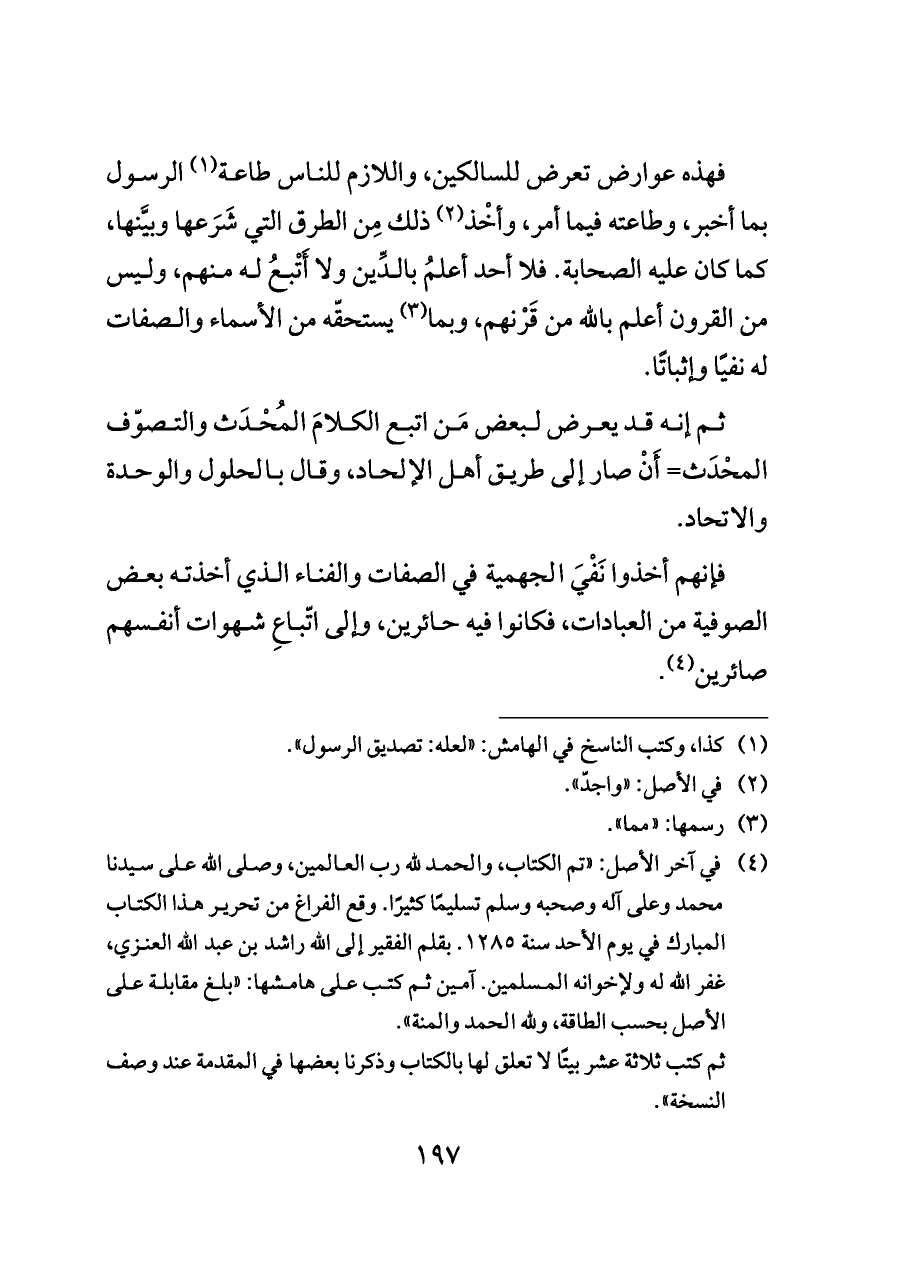 (¬٤) في آخر الأصل: "تم الكتاب، والحمد لله رب العالمين، وصلى الله على سيدنا محمد وعلى آله وصحبه وسلم تسليمًا كثيرًا. وقع الفراغ من تحرير هذا الكتاب المبارك في يوم الأحد سنة ١٢٨٥. بقلم الفقير إلى الله راشد بن عبد الله العنزي، غفر الله له ولإخوانه المسلمين. آمين ثم كتب على هامشها: "بلغ مقابلة على الأصل بحسب الطاقة، ولله الحمد والمنة".