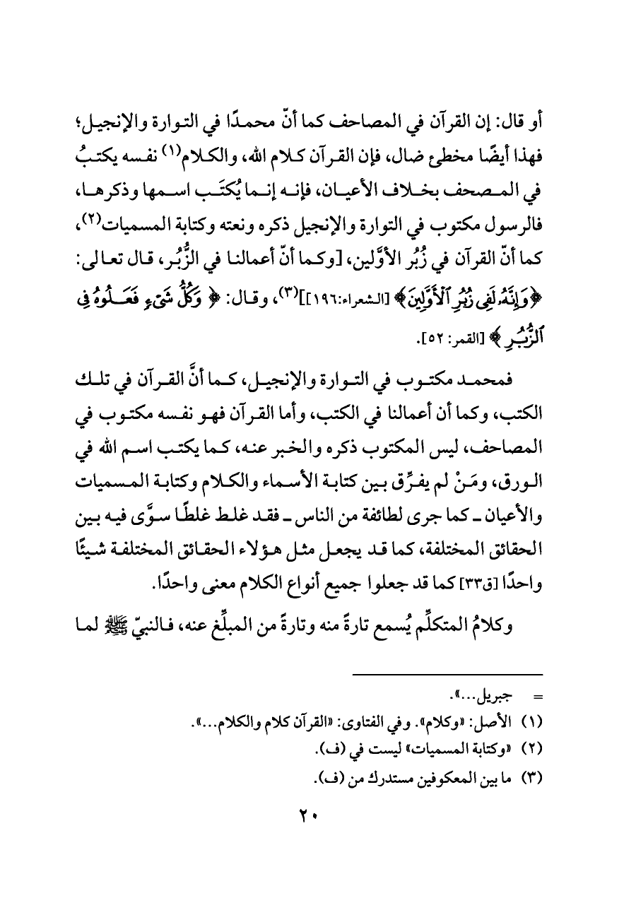 فمحمد مكتوب في التوارة والإنجيل، كما أنَّ القرآن في تلك الكتب، وكما أن أعمالنا في الكتب، وأما القرآن فهو نفسه مكتوب في المصاحف، ليس المكتوب ذكره والخبر عنه، كما يكتب اسم الله في الورق، ومَنْ لم يفرِّق بين كتابة الأسماء والكلام وكتابة المسميات والأعيان ــ كما جرى لطائفة من الناس ــ فقد غلط غلطًا سوَّى فيه بين الحقائق المختلفة، كما قد يجعل مثل هؤلاء الحقائق المختلفة شيئًا واحدًا [ق ٣٣] كما قد جعلوا جميع أنواع الكلام معنى واحدًا.