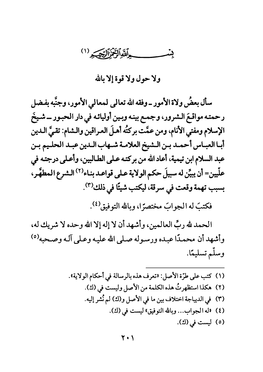 سأل بعضُ ولاة الأمور ــ وفقه الله تعالى لمعالي الأمور، وجنَّبه بفضل رحمته مواقعَ الشرور، وجمع بينه وبين أوليائه في دار الحبور ــ شيخَ الإسلام ومفتي الأنام، ومن عمَّت بركتُه أهلَ العراقين والشام: تقيَّ الدين أبا العباس أحمد بن الشيخ العلامة شهاب الدين عبد الحليم بن عبد السلام ابن تيمية، أعاد الله من بركته على الطالبين، وأعلى درجته في علّيين= أن يبيِّن له سبيلَ حكم الولاية على قواعد بناء (¬٢) الشرع المطهَّر، بسبب تهمة وقعت في سرقة، ليكتب شيئًا في ذلك (¬٣).