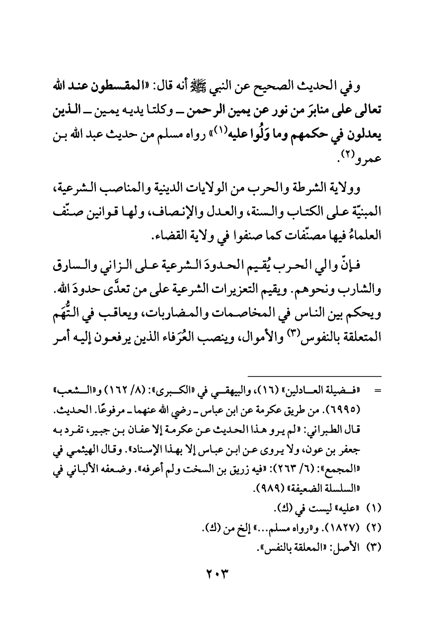وفي الحديث الصحيح عن النبي - صلى الله عليه وسلم - أنه قال: "المقسطون عند الله تعالى على منابرَ من نور عن يمين الرحمن ــ وكلتا يديه يمين ــ الذين يعدلون في حكمهم وما وَلُوا عليه (¬١) " رواه مسلم من حديث عبد الله بن عمرو (¬٢).