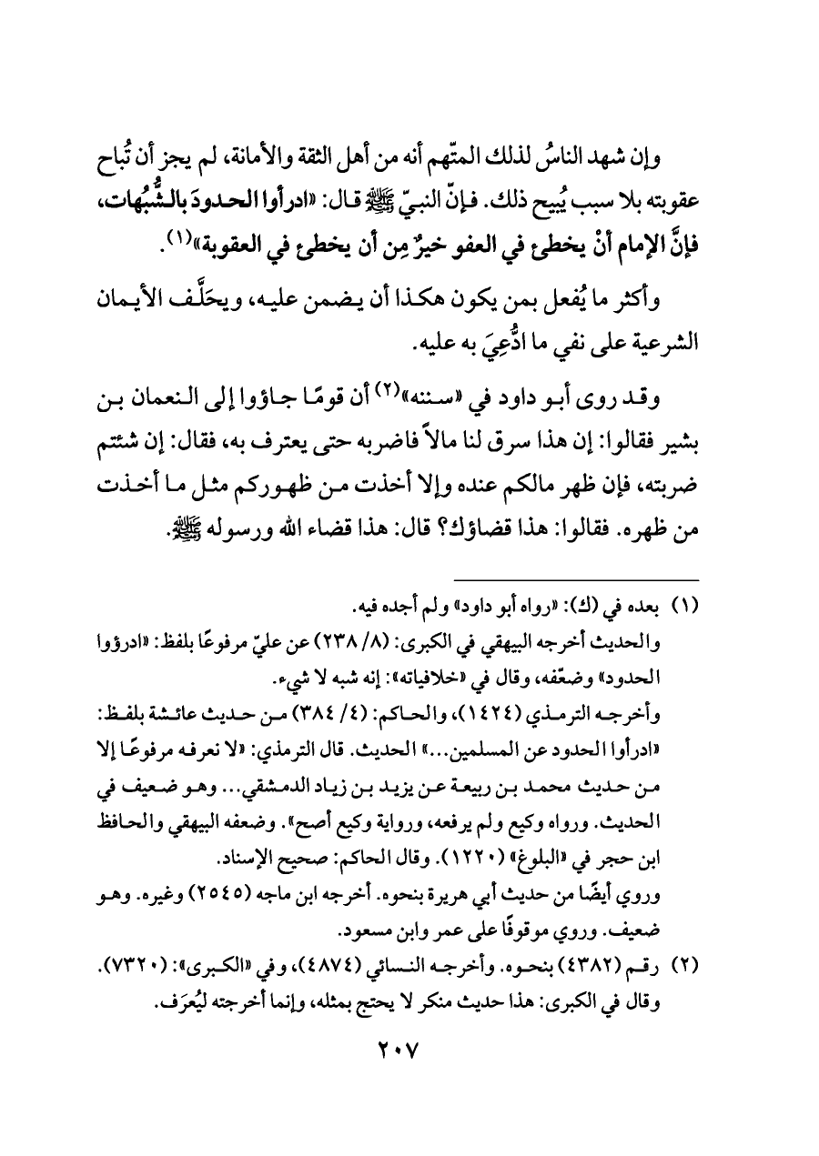 وإن شهد الناسُ لذلك المتّهم أنه من أهل الثقة والأمانة، لم يجز أن تُباح عقوبته بلا سبب يُبيح ذلك. فإنّ النبيّ - صلى الله عليه وسلم - قال: "ادرأوا الحدودَ بالشُّبُهات، فإنَّ الإمام أنْ يخطئ في العفو خيرٌ مِن أن يخطئ في العقوبة" (¬١).