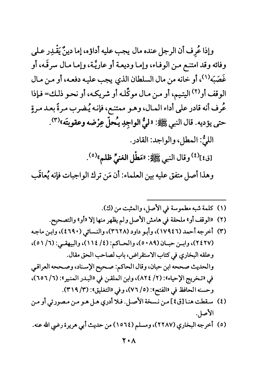 وإذا عُرِف أن الرجل عنده مال يجب عليه أداؤه، إما دينٌ يَقْدِر على وفائه وقد امتنع من الوفاء، وإما وديعة أو عاريَّة، وإما مال سرقَه، أو غَصَبَه (¬١)، أو خانه من مال السلطان الذي يجب عليه دفعه، أو من مال الوقف أو (¬٢) اليتيم، أو من مال موكِّله أو شريكه، أو نحو ذلك= فإذا عُرف أنه قادر على أداء المال، وهو ممتنع، فإنه يُضرب مرةً بعد مرةٍ حتى يؤديه. قال النبي - صلى الله عليه وسلم -: "ليُّ الواجِدِ يُحلّ عِرْضه وعقوبتَه" (¬٣).