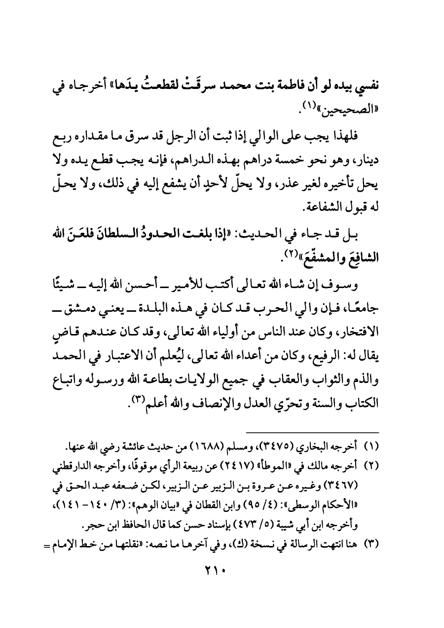 فلهذا يجب على الوالي إذا ثبت أن الرجل قد سرق ما مقداره ربع دينار، وهو نحو خمسة دراهم بهذه الدراهم، فإنه يجب قطع يده ولا يحل تأخيره لغير عذر، ولا يحلّ لأحدٍ أن يشفع إليه في ذلك، ولا يحلّ له قبول الشفاعة.