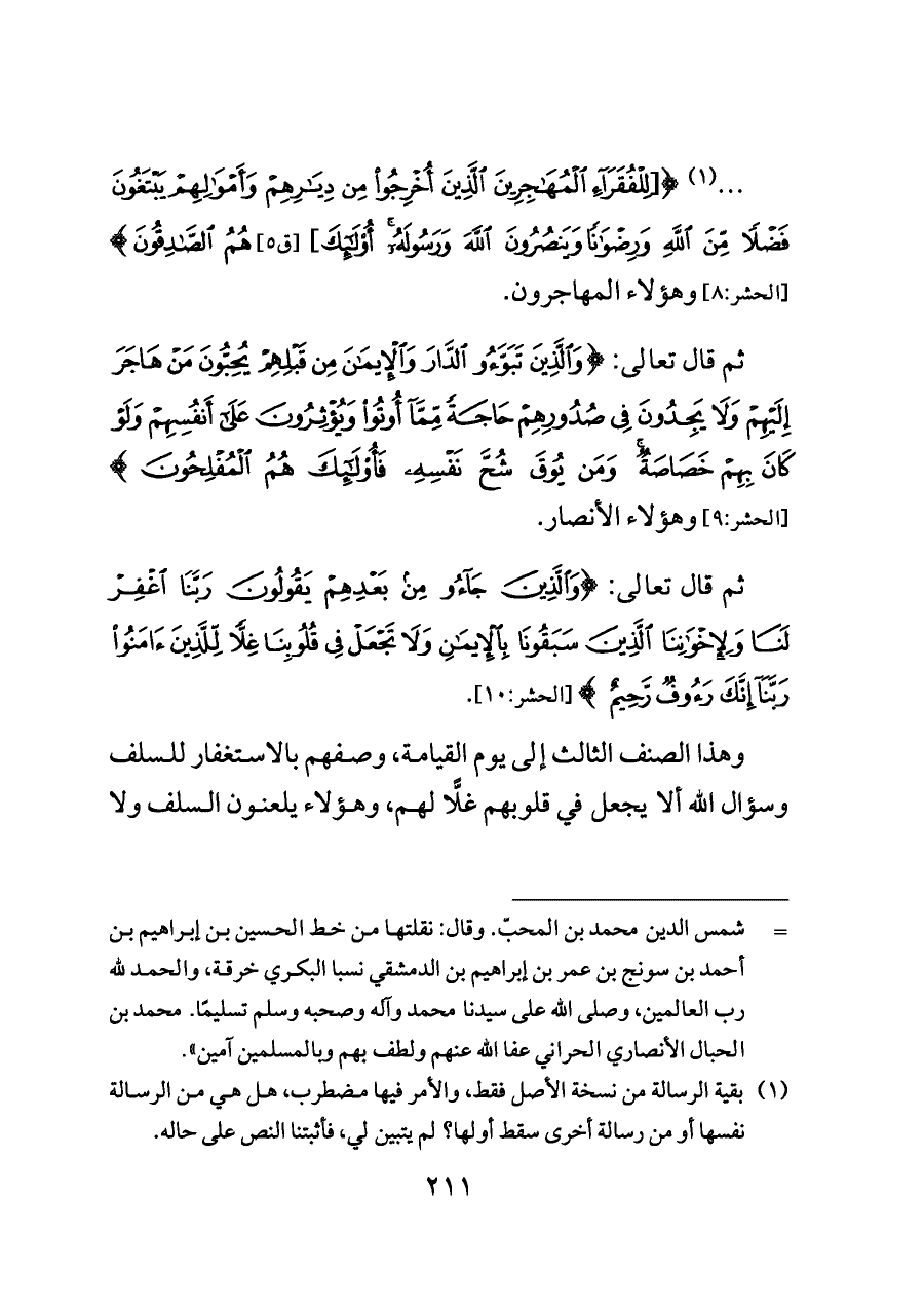 (¬١) {[لِلْفُقَرَاءِ الْمُهَاجِرِينَ الَّذِينَ أُخْرِجُوا مِنْ دِيَارِهِمْ وَأَمْوَالِهِمْ يَبْتَغُونَ فَضْلًا مِنَ اللَّهِ وَرِضْوَانًا وَيَنْصُرُونَ اللَّهَ وَرَسُولَهُ أُولَئِكَ] [ق ٥] هُمُ الصَّادِقُونَ} [الحشر:٨] وهؤلاء المهاجرون.