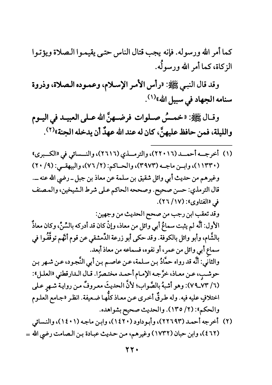 (¬١) أخرجه أحمد (٢٢٠١٦)، والترمذي (٢٦١٦)، والنسائي في "الكبرى" (١١٣٣٠)، وابن ماجه (٣٩٧٣)، والحاكم: (٢/ ٧٦)، والبيهقي: (٩/ ٢٠) وغيرهم من حديث أبي وائل شقيق بن سلمة عن معاذ بن جبل ــ رضي الله عنه ــ. قال الترمذي: حسن صحيح. وصححه الحاكم على شرط الشيخين، والمصنف في "الفتاوى": (١٧/ ٢٦).