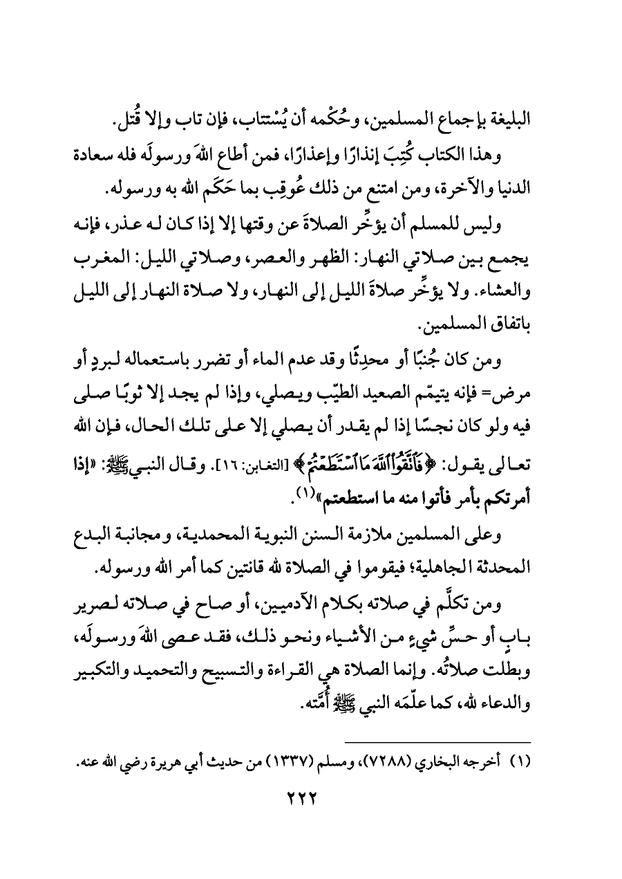 وعلى المسلمين ملازمة السنن النبوية المحمدية، ومجانبة البدع المحدثة الجاهلية؛ فيقوموا في الصلاة لله قانتين كما أمر الله ورسوله.