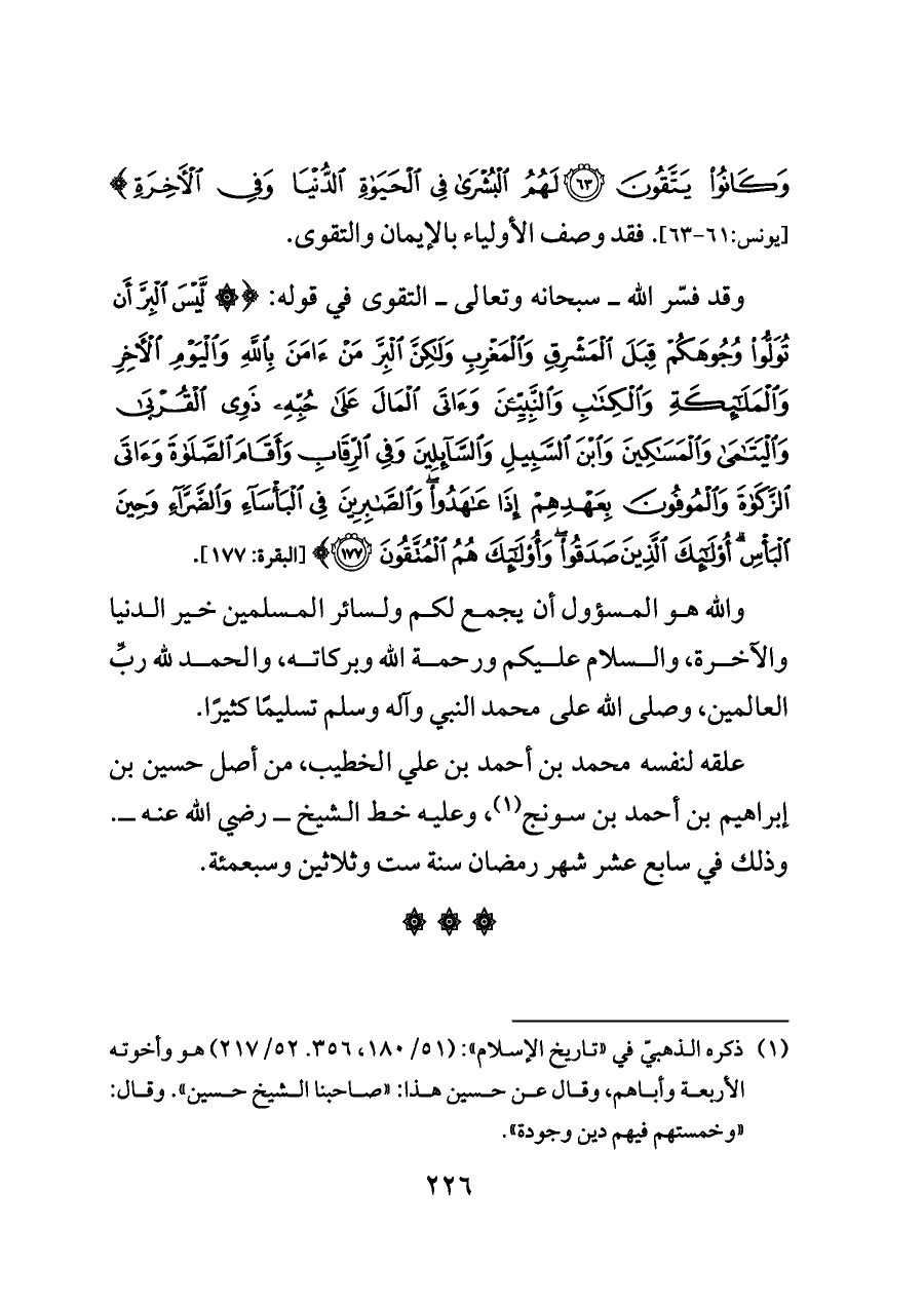 علقه لنفسه محمد بن أحمد بن علي الخطيب، من أصل حسين بن إبراهيم بن أحمد بن سونج (¬١)، وعليه خط الشيخ ــ رضي الله عنه ــ. وذلك في سابع عشر شهر رمضان سنة ست وثلاثين وسبعمئة.