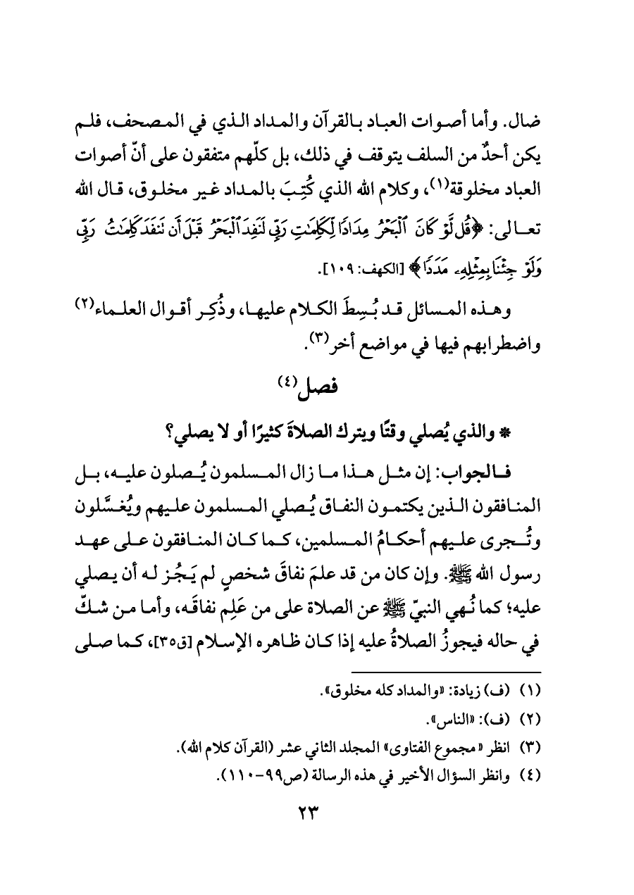 ضال. وأما أصوات العباد بالقرآن والمداد الذي في المصحف، فلم يكن أحدٌ من السلف يتوقف في ذلك، بل كلّهم متفقون على أنّ أصوات العباد مخلوقة (¬١)، وكلام الله الذي كُتِبَ بالمداد غير مخلوق، قال الله تعالى: {قُلْ لَوْ كَانَ الْبَحْرُ مِدَادًا لِكَلِمَاتِ رَبِّي لَنَفِدَ الْبَحْرُ قَبْلَ أَنْ تَنْفَدَ كَلِمَاتُ رَبِّي وَلَوْ جِئْنَا بِمِثْلِهِ مَدَدًا} [الكهف: ١٠٩].