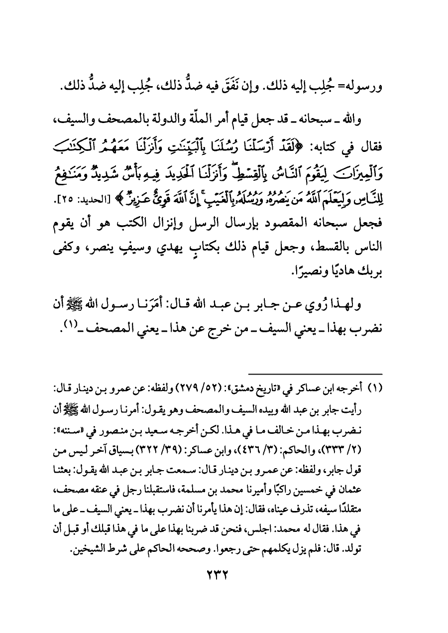 والله ــ سبحانه ــ قد جعل قيام أمر الملّة والدولة بالمصحف والسيف، فقال في كتابه: {لَقَدْ أَرْسَلْنَا رُسُلَنَا بِالْبَيِّنَاتِ وَأَنْزَلْنَا مَعَهُمُ الْكِتَابَ وَالْمِيزَانَ لِيَقُومَ النَّاسُ بِالْقِسْطِ وَأَنْزَلْنَا الْحَدِيدَ فِيهِ بَأْسٌ شَدِيدٌ وَمَنَافِعُ لِلنَّاسِ وَلِيَعْلَمَ اللَّهُ مَنْ يَنْصُرُهُ وَرُسُلَهُ بِالْغَيْبِ إِنَّ اللَّهَ قَوِيٌّ عَزِيزٌ} [الحديد: ٢٥]. فجعل سبحانه المقصود بإرسال الرسل وإنزال الكتب هو أن يقوم الناس بالقسط، وجعل قيام ذلك بكتابٍ يهدي وسيفٍ ينصر، وكفى بربك هاديًا ونصيرًا.