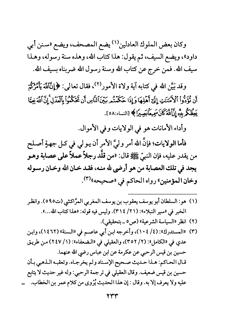 وكان بعض الملوك العادلين (¬١) يضع المصحف، ويضع "سنن أبي داود"، ويضع السيف، ثم يقول: هذا كتاب الله، وهذه سنة رسوله، وهذا سيف الله. فمن خرج عن كتاب الله وسنة رسول الله ضربناه بسيف الله.