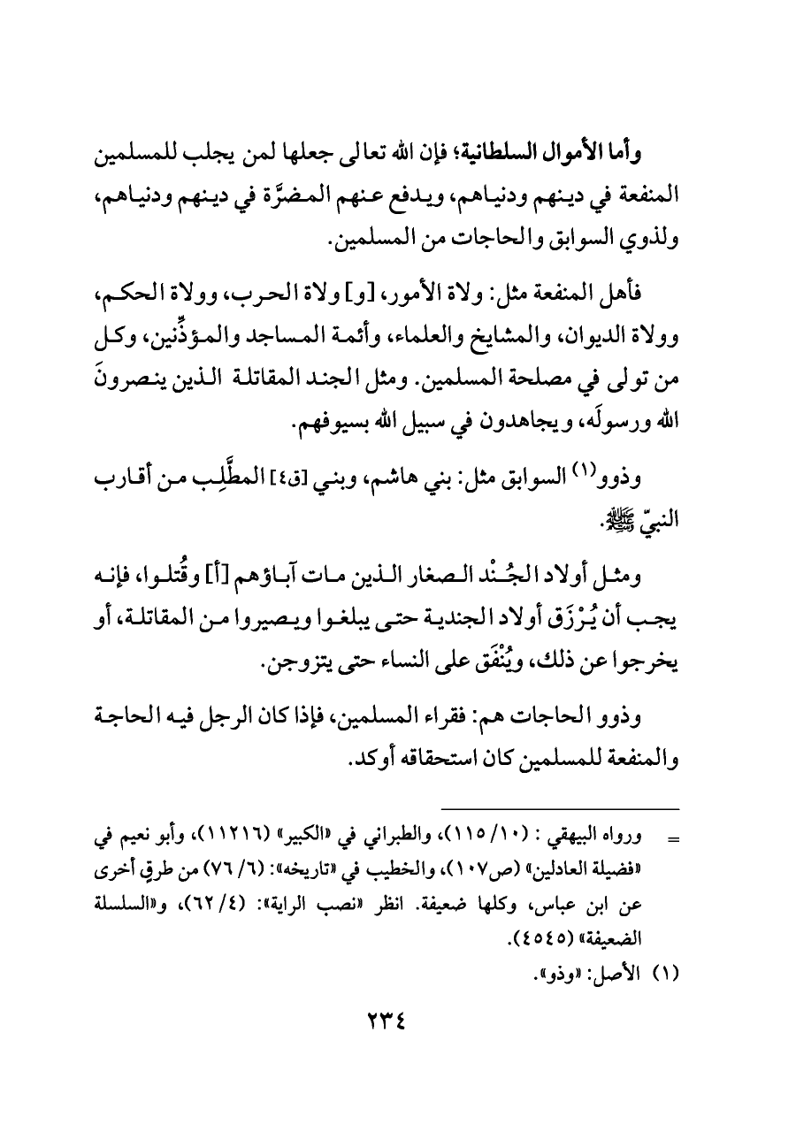 وأما الأموال السلطانية؛ فإن الله تعالى جعلها لمن يجلب للمسلمين المنفعة في دينهم ودنياهم، ويدفع عنهم المضرَّة في دينهم ودنياهم، ولذوي السوابق والحاجات من المسلمين.