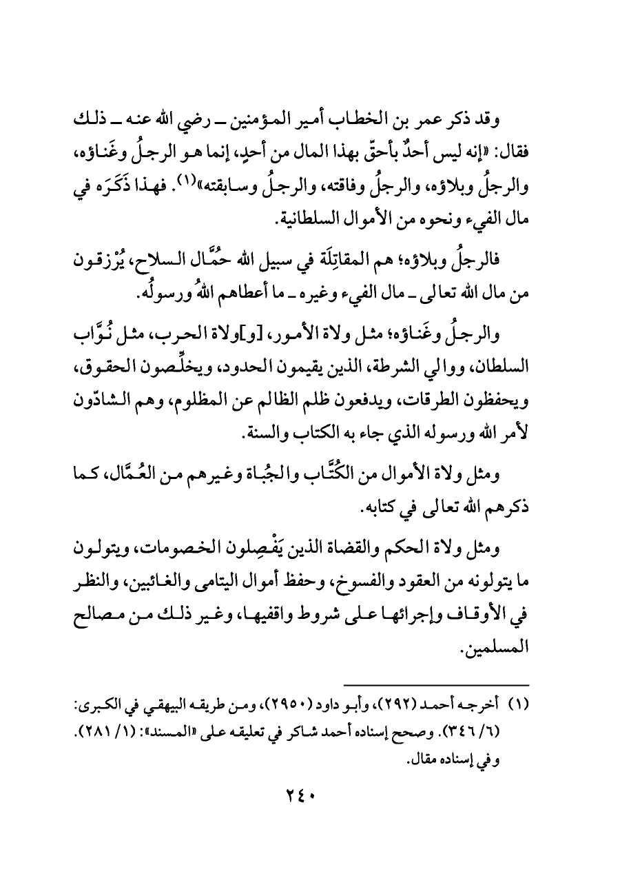 وقد ذكر عمر بن الخطاب أمير المؤمنين ــ رضي الله عنه ــ ذلك فقال: "إنه ليس أحدٌ بأحقّ بهذا المال من أحدٍ، إنما هو الرجلُ وغَناؤه، والرجلُ وبلاؤه، والرجلُ وفاقته، والرجلُ وسابقته" (¬١). فهذا ذَكَرَه في مال الفيء ونحوه من الأموال السلطانية.