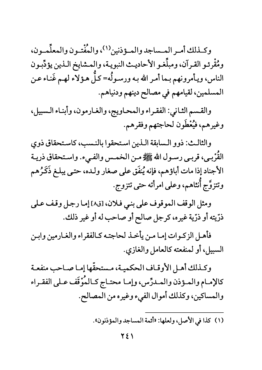 وكذلك أهل الأوقاف الحكمية، مستحقّها إما صاحب منفعة كالإمام والمؤذن والمدرِّس، وإما محتاج كالمُوْقَف على الفقراء والمساكين، وكذلك أموال الفيء وغيره من المصالح.