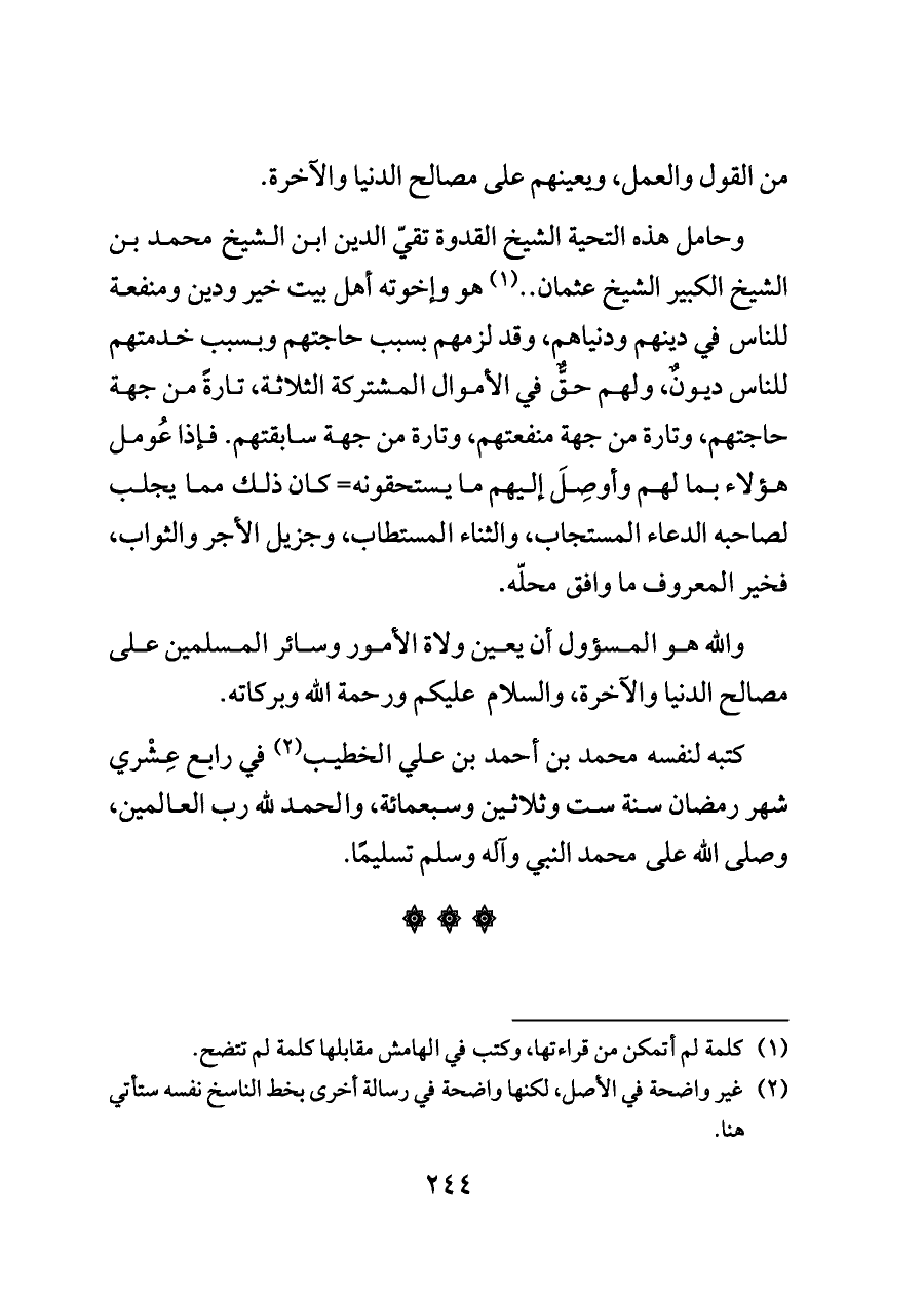 (¬٢) غير واضحة في الأصل، لكنها واضحة في رسالة أخرى بخط الناسخ نفسه ستأتي هنا.