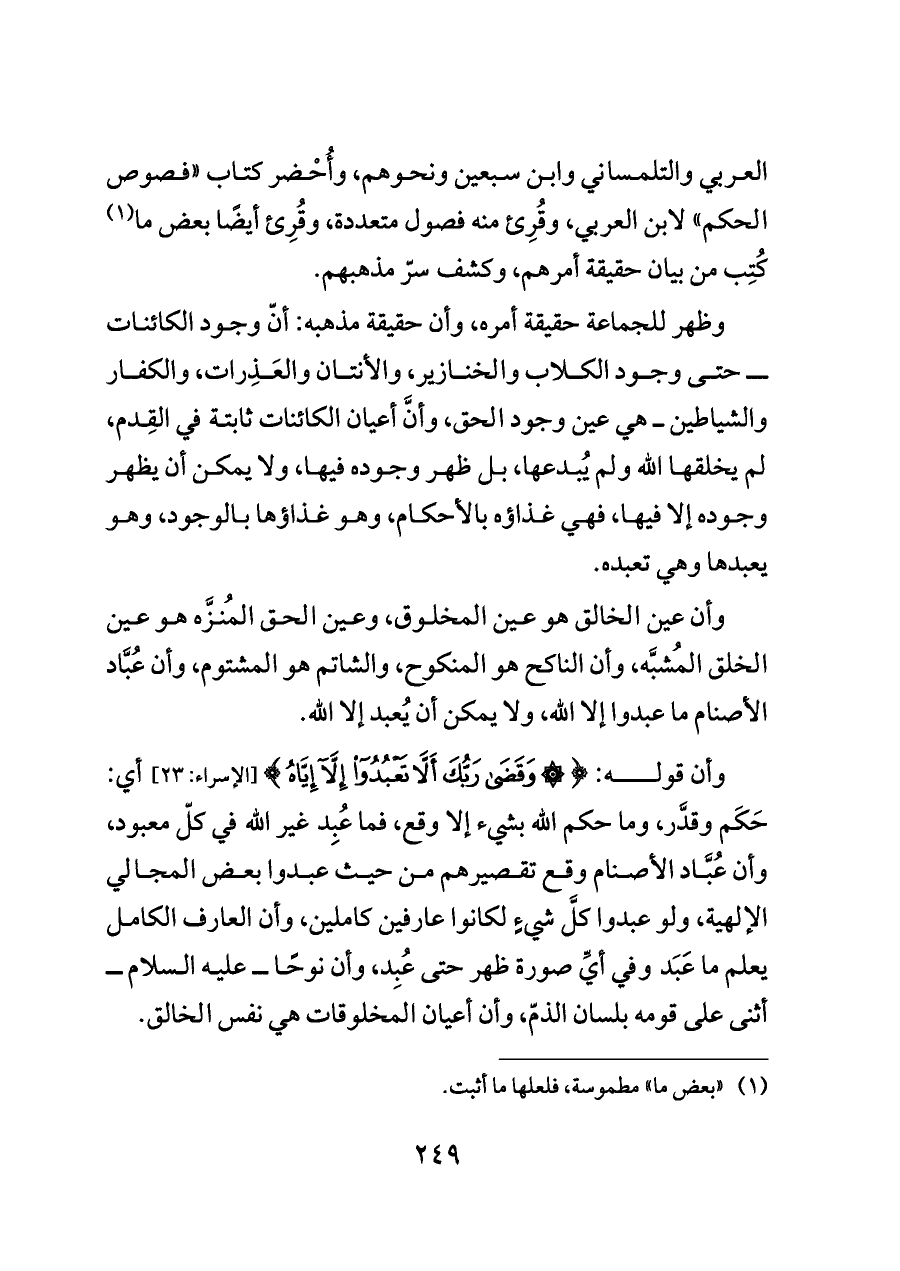 وأن قوله: {وَقَضَى رَبُّكَ أَلَّا تَعْبُدُوا إِلَّا إِيَّاهُ} [الإسراء: ٢٣] أي: حَكَم وقدَّر، وما حكم الله بشيء إلا وقع، فما عُبِد غير الله في كلّ معبود، وأن عُبَّاد الأصنام وقع تقصيرهم من حيث عبدوا بعض المجالي الإلهية، ولو عبدوا كلَّ شيءٍ لكانوا عارفين كاملين، وأن العارف الكامل يعلم ما عَبَد وفي أيِّ صورة ظهر حتى عُبِد، وأن نوحًا ــ عليه السلام ــ أثنى على قومه بلسان الذمّ، وأن أعيان المخلوقات هي نفس الخالق.