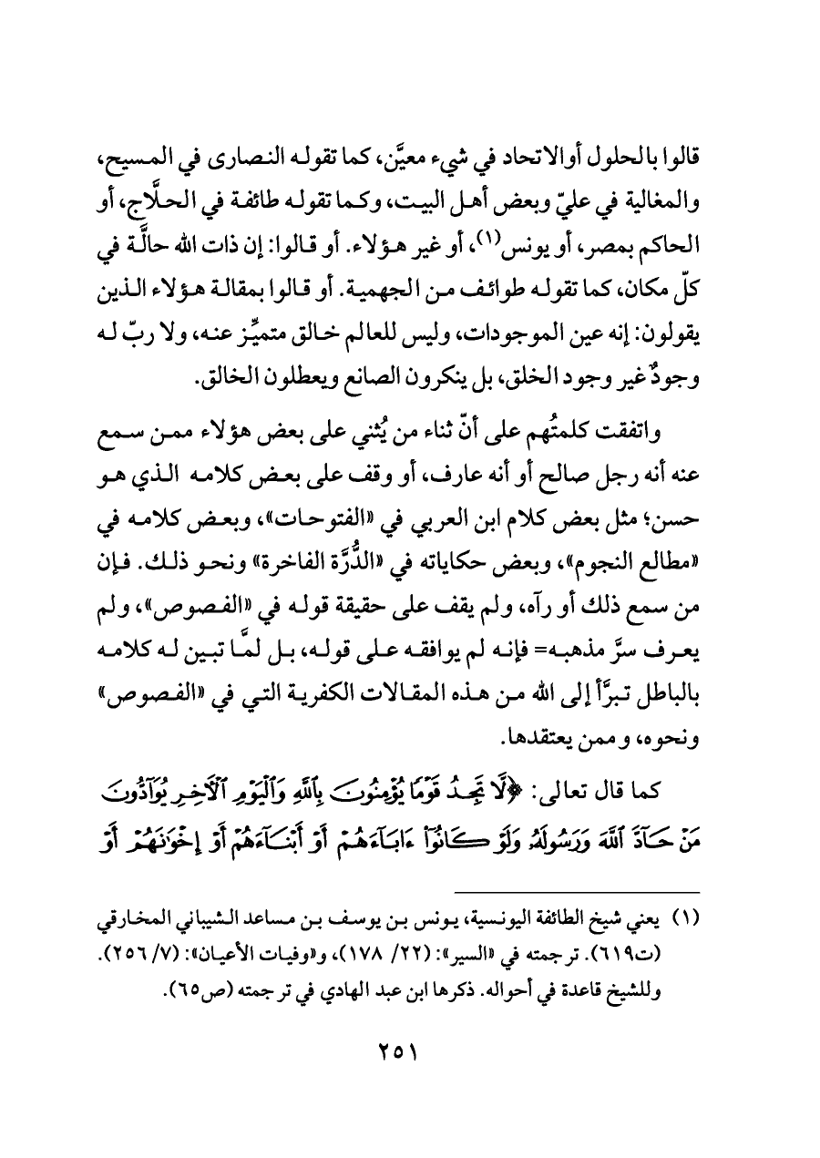 واتفقت كلمتُهم على أنّ ثناء من يُثني على بعض هؤلاء ممن سمع عنه أنه رجل صالح أو أنه عارف، أو وقف على بعض كلامه الذي هو حسن؛ مثل بعض كلام ابن العربي في "الفتوحات"، وبعض كلامه في "مطالع النجوم"، وبعض حكاياته في "الدُّرَّة الفاخرة" ونحو ذلك. فإن من سمع ذلك أو رآه، ولم يقف على حقيقة قوله في "الفصوص"، ولم يعرف سرَّ مذهبه= فإنه لم يوافقه على قوله، بل لمَّا تبين له كلامه بالباطل تبرَّأ إلى الله من هذه المقالات الكفرية التي في "الفصوص" ونحوه، وممن يعتقدها.