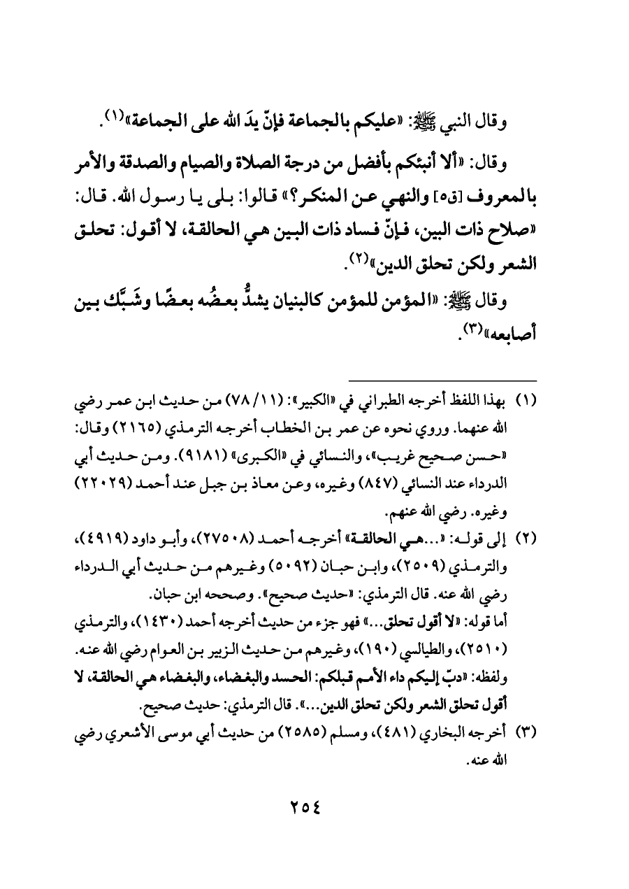 (¬٢) إلى قوله: " ... هي الحالقة" أخرجه أحمد (٢٧٥٠٨)، وأبو داود (٤٩١٩)، والترمذي (٢٥٠٩)، وابن حبان (٥٠٩٢) وغيرهم من حديث أبي الدرداء رضي الله عنه. قال الترمذي: "حديث صحيح". وصححه ابن حبان.