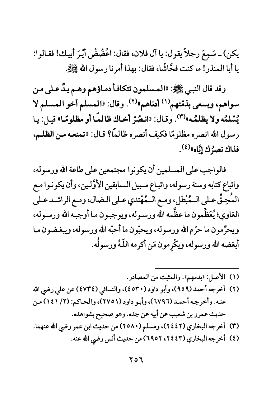 وقد قال النبي - صلى الله عليه وسلم -: "المسلمون تتكافأ دماؤهم وهم يدٌ على من سواهم، ويسعى بذمّتهم (¬١) أدناهم" (¬٢). وقال: "المسلم أخو المسلم لا يُسْلمُه ولا يظلمُه" (¬٣). وقال: "انصُرْ أخاك ظالمًا أو مظلومًا" قيل: يا رسول الله انصره مظلومًا فكيف أنصره ظالمًا؟ قال: "تمنعه من الظلم، فذاك نصرُك إيَّاه" (¬٤).