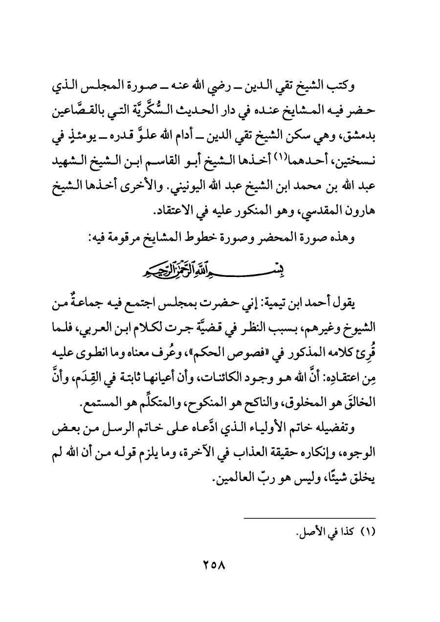 وكتب الشيخ تقي الدين ــ رضي الله عنه ــ صورة المجلس الذي حضر فيه المشايخ عنده في دار الحديث السُّكَّريَّة التي بالقصَّاعين بدمشق، وهي سكن الشيخ تقي الدين ــ أدام الله علوَّ قدره ــ يومئذٍ في نسختين، أحدهما (¬١) أخذها الشيخ أبو القاسم ابن الشيخ الشهيد عبد الله بن محمد ابن الشيخ عبد الله اليونيني. والأخرى أخذها الشيخ هارون المقدسي، وهو المنكور عليه في الاعتقاد.