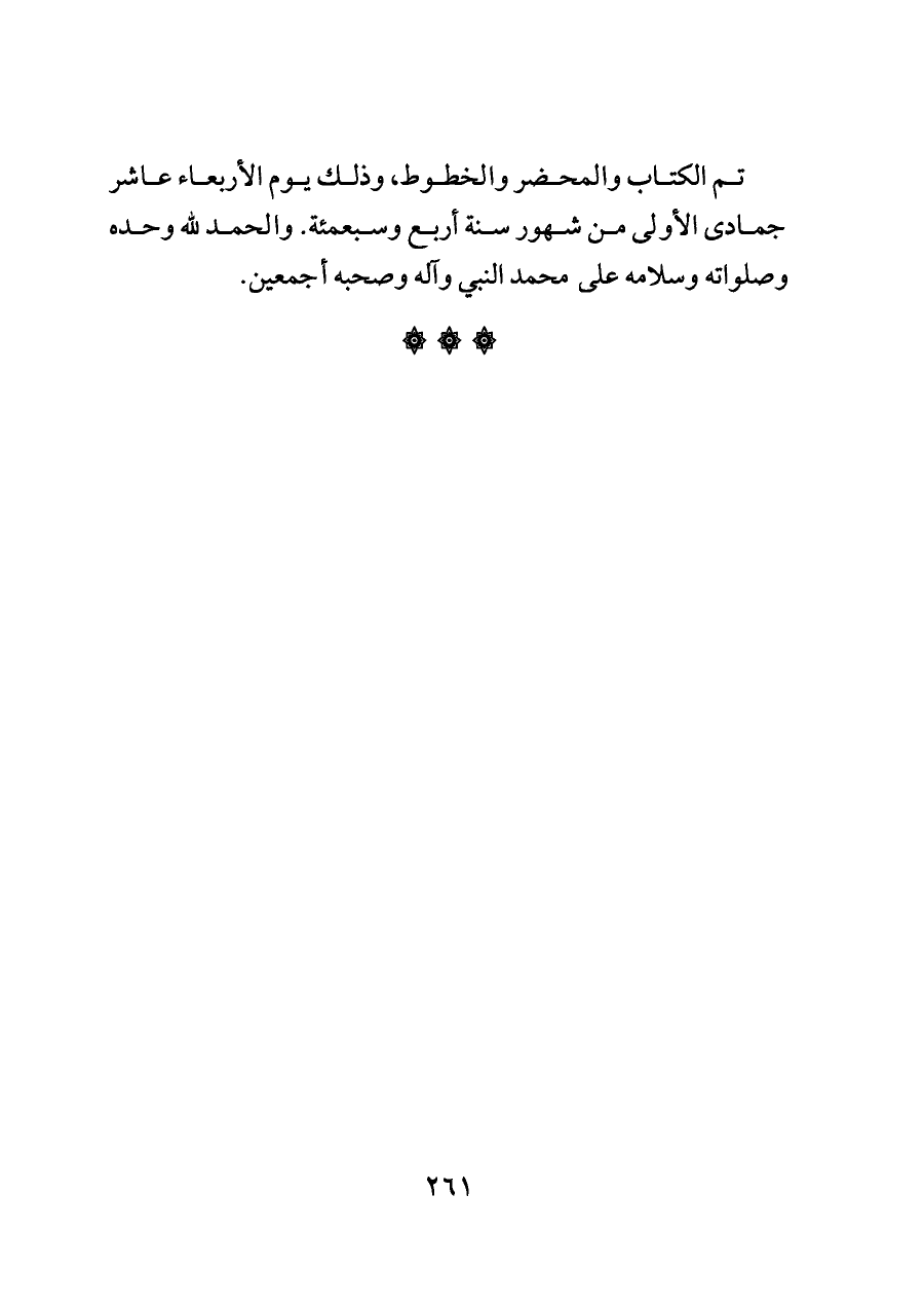 تم الكتاب والمحضر والخطوط، وذلك يوم الأربعاء عاشر جمادى الأولى من شهور سنة أربع وسبعمئة. والحمد لله وحده وصلواته وسلامه على محمد النبي وآله وصحبه أجمعين.