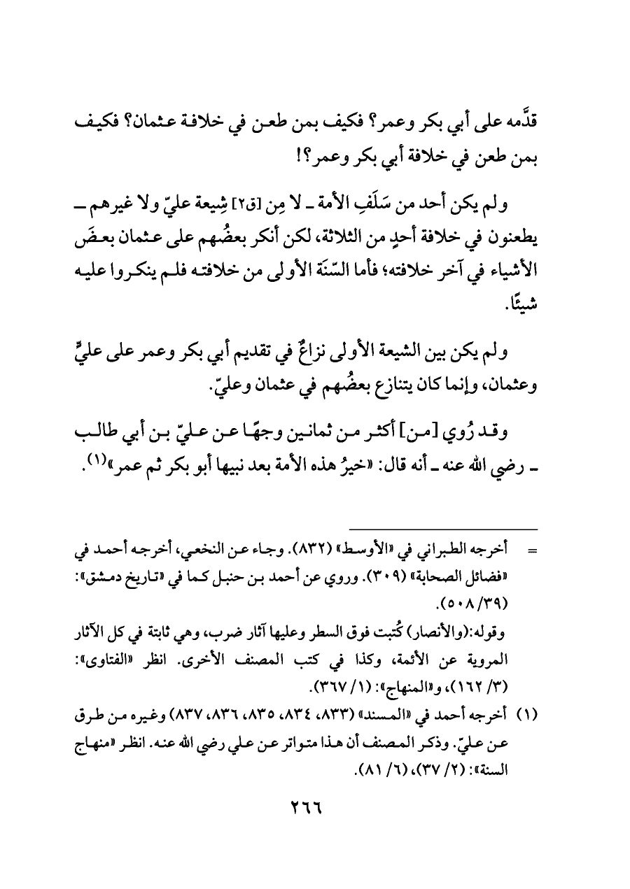 قدَّمه على أبي بكر وعمر؟ فكيف بمن طعن في خلافة عثمان؟ فكيف بمن طعن في خلافة أبي بكر وعمر؟!