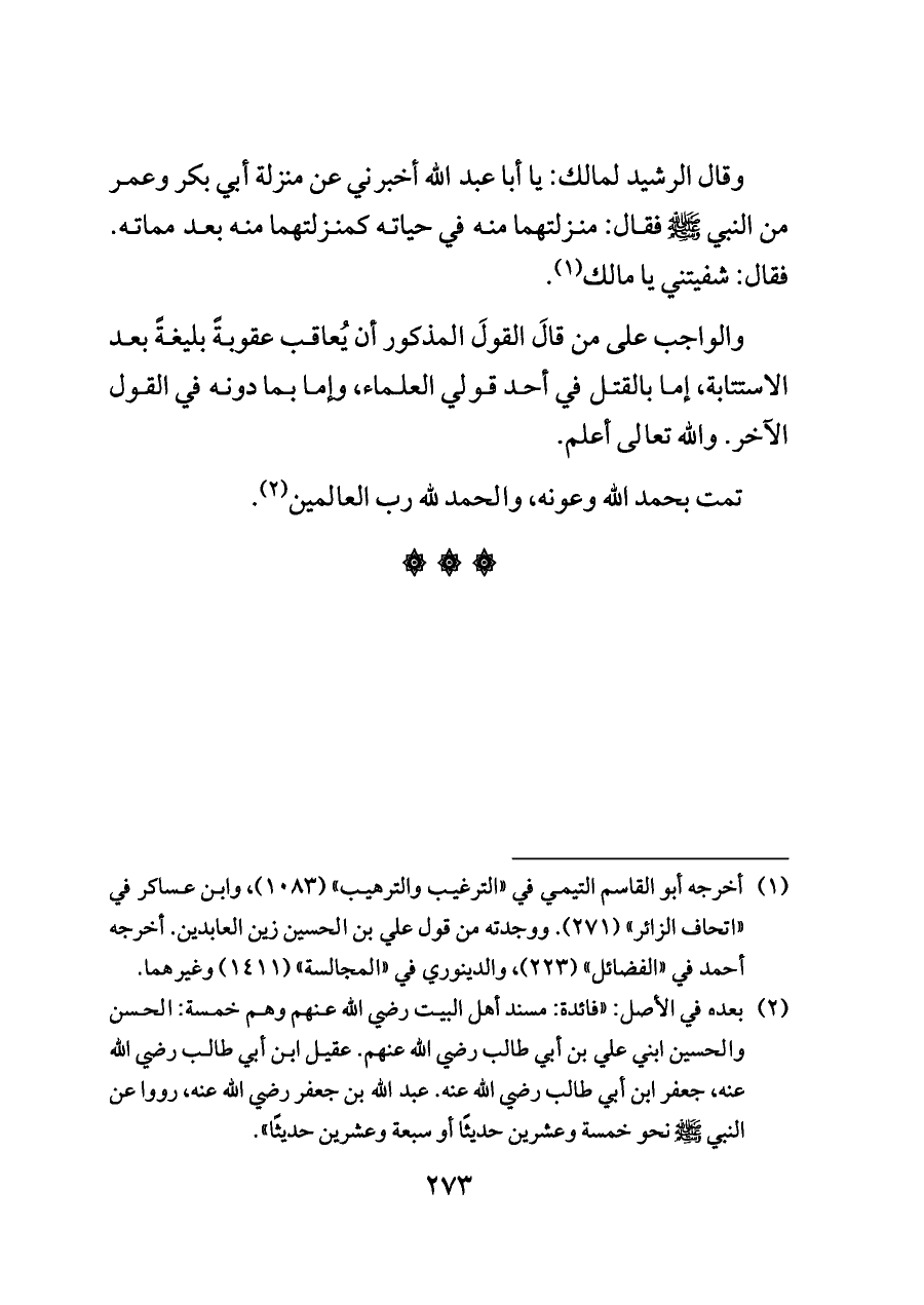 (¬٢) بعده في الأصل: "فائدة: مسند أهل البيت رضي الله عنهم وهم خمسة: الحسن والحسين ابني علي بن أبي طالب رضي الله عنهم. عقيل ابن أبي طالب رضي الله عنه، جعفر ابن أبي طالب رضي الله عنه. عبد الله بن جعفر رضي الله عنه، رووا عن النبي - صلى الله عليه وسلم - نحو خمسة وعشرين حديثًا أو سبعة وعشرين حديثًا".
