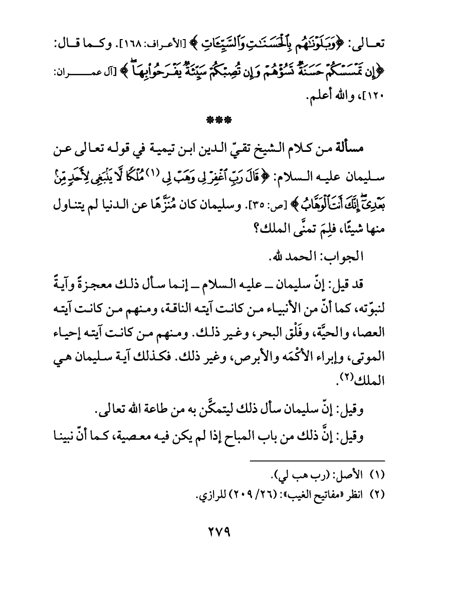 مسألة من كلام الشيخ تقيّ الدين ابن تيمية في قوله تعالى عن سليمان عليه السلام: {قَالَ رَبِّ اغْفِرْ لِي وَهَبْ لِي (¬١) مُلْكًا لَا يَنْبَغِي لِأَحَدٍ مِنْ بَعْدِي إِنَّكَ أَنْتَ الْوَهَّابُ} [ص: ٣٥]. وسليمان كان مُنَزَّهًا عن الدنيا لم يتناول منها شيئًا، فلِمَ تمنَّى الملك؟