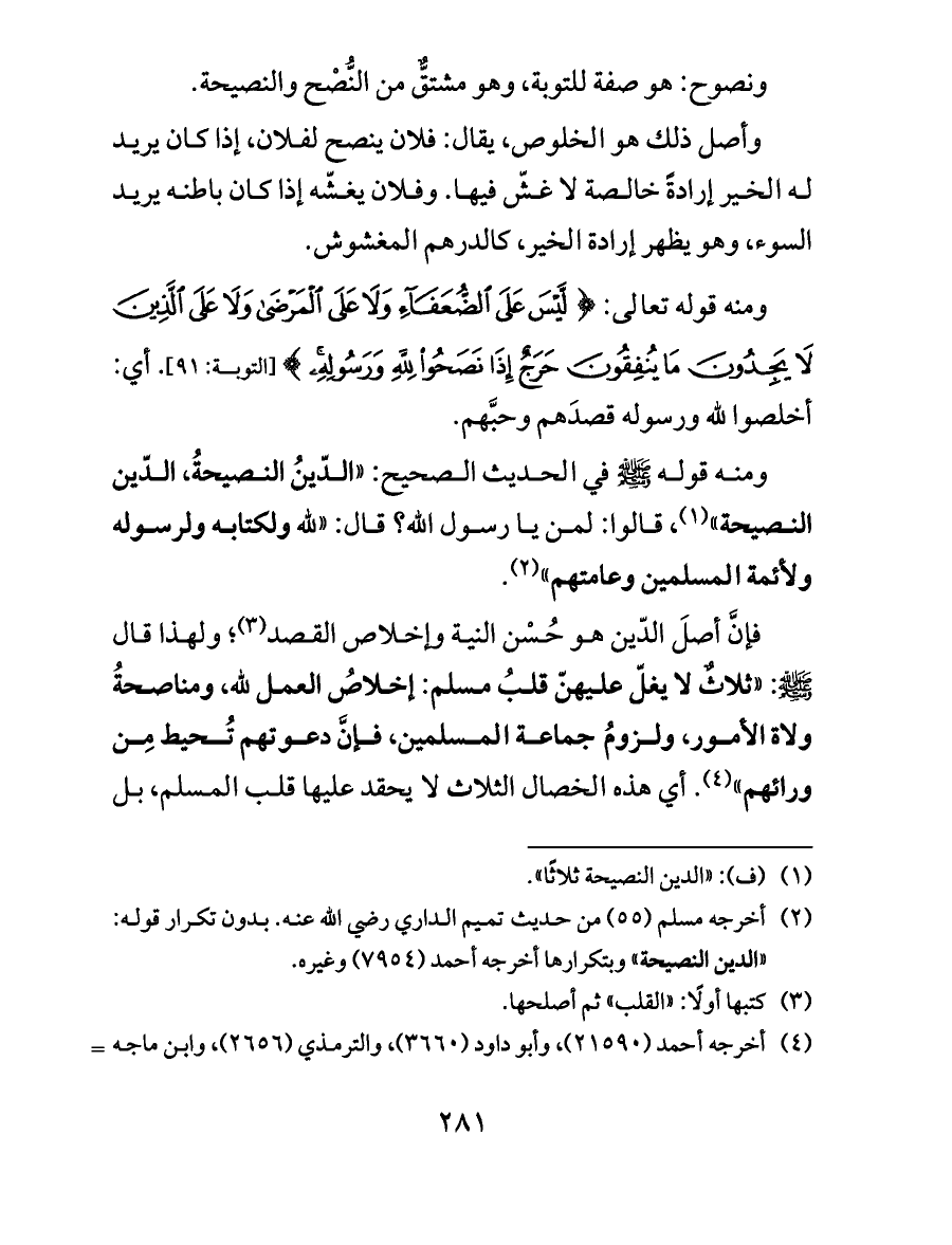 ومنه قوله - صلى الله عليه وسلم - في الحديث الصحيح: "الدّينُ النصيحةُ، الدّين النصيحة" (¬١)، قالوا: لمن يا رسول الله؟ قال: "لله ولكتابه ولرسوله ولأئمة المسلمين وعامتهم" (¬٢).