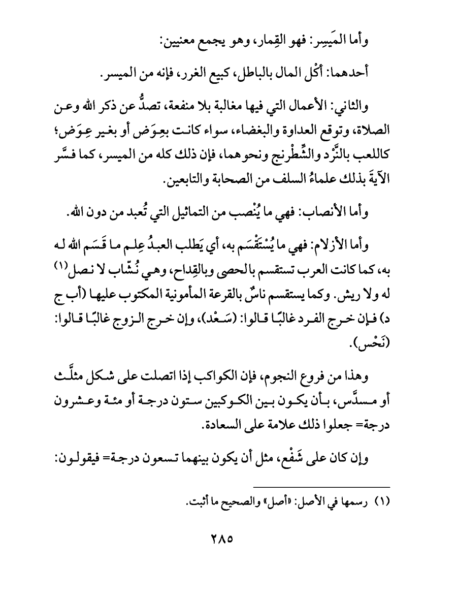 وأما الأزلام: فهي ما يُسْتَقْسَم به، أي يَطلب العبدُ عِلم ما قَسَم الله له به، كما كانت العرب تستقسم بالحصى وبالقِداح، وهي نُشّاب لا نصل (¬١) له ولا ريش. وكما يستقسم ناسٌ بالقرعة المأمونية المكتوب عليها (أب ج د) فإن خرج الفرد غالبًا قالوا: (سَعْد)، وإن خرج الزوج غالبًا قالوا: (نَحْس).