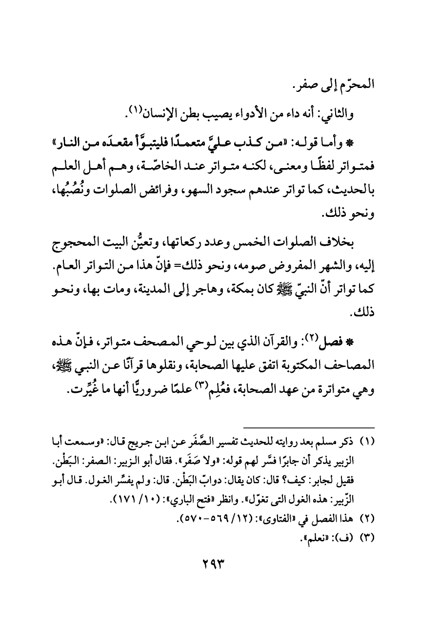 * فصل (¬٢): والقرآن الذي بين لوحي المصحف متواتر، فإنّ هذه المصاحف المكتوبة اتفق عليها الصحابة، ونقلوها قرآنًا عن النبي - صلى الله عليه وسلم -، وهي متواترة من عهد الصحابة، فعُلِم (¬٣) علمًا ضروريًّا أنها ما غُيِّرت.