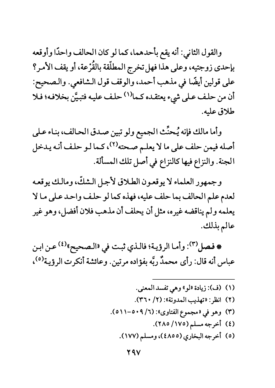 * فصل (¬٣): وأما الرؤية؛ فالذي ثبت في "الصحيح" (¬٤) عن ابن عباس أنه قال: رأى محمدٌ ربَّه بفؤاده مرتين. وعائشة أنكرت الرؤية (¬٥)،