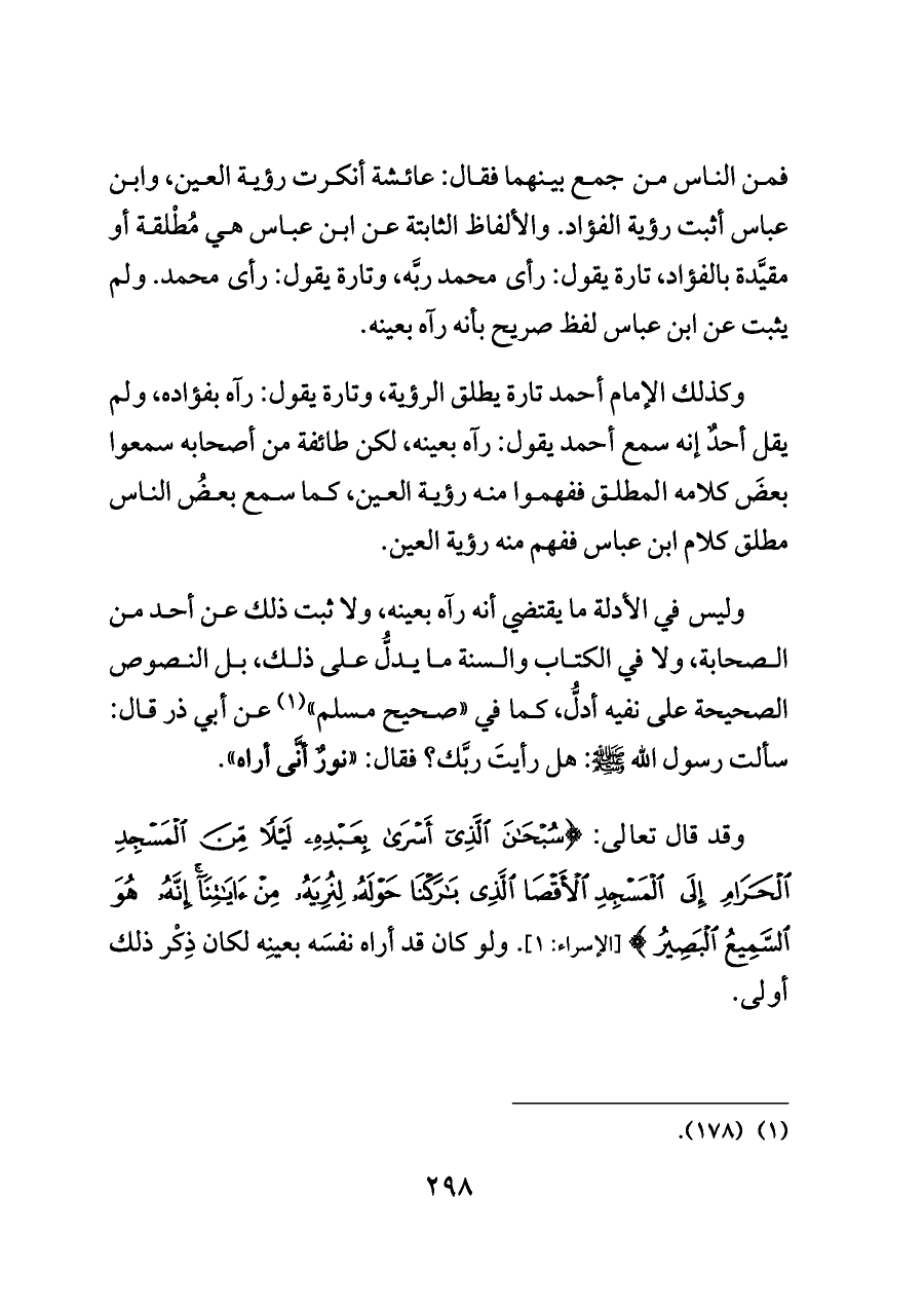 وكذلك الإمام أحمد تارة يطلق الرؤية، وتارة يقول: رآه بفؤاده، ولم يقل أحدٌ إنه سمع أحمد يقول: رآه بعينه، لكن طائفة من أصحابه سمعوا بعضَ كلامه المطلق ففهموا منه رؤية العين، كما سمع بعضُ الناس مطلق كلام ابن عباس ففهم منه رؤية العين.