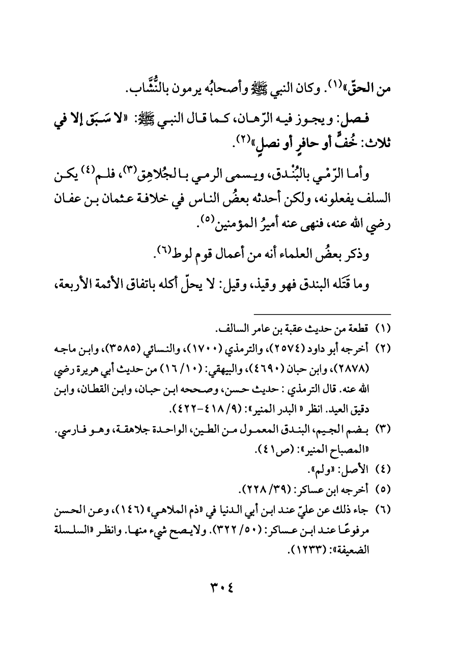وأما الرّمْي بالبُنْدق، ويسمى الرمي بالجُلاهِق (¬٣)، فلم (¬٤) يكن السلف يفعلونه، ولكن أحدثه بعضُ الناس في خلافة عثمان بن عفان رضي الله عنه، فنهى عنه أميرُ المؤمنين (¬٥).