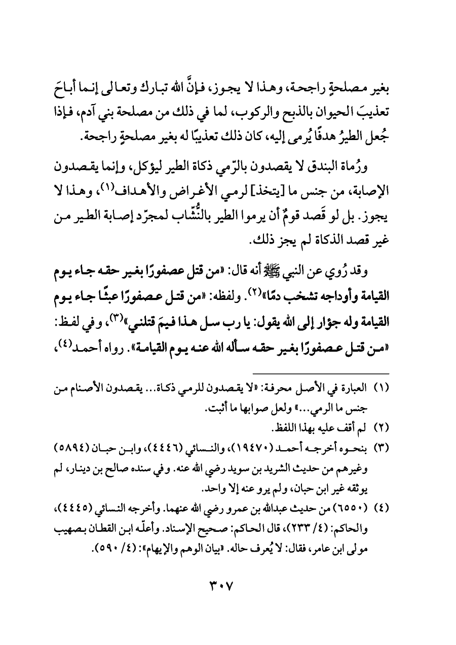 وقد رُوي عن النبي - صلى الله عليه وسلم - أنه قال: «من قتل عصفورًا بغير حقه جاء يوم القيامة وأوداجه تشخب دمًا» (¬٢). ولفظه: «من قتل عصفورًا عبثًا جاء يوم القيامة وله جؤار إلى الله يقول: يا رب سل هذا فيمَ قتلني» (¬٣)، وفي لفظ: «من قتل عصفورًا بغير حقه سأله الله عنه يوم القيامة». رواه أحمد (¬٤)،