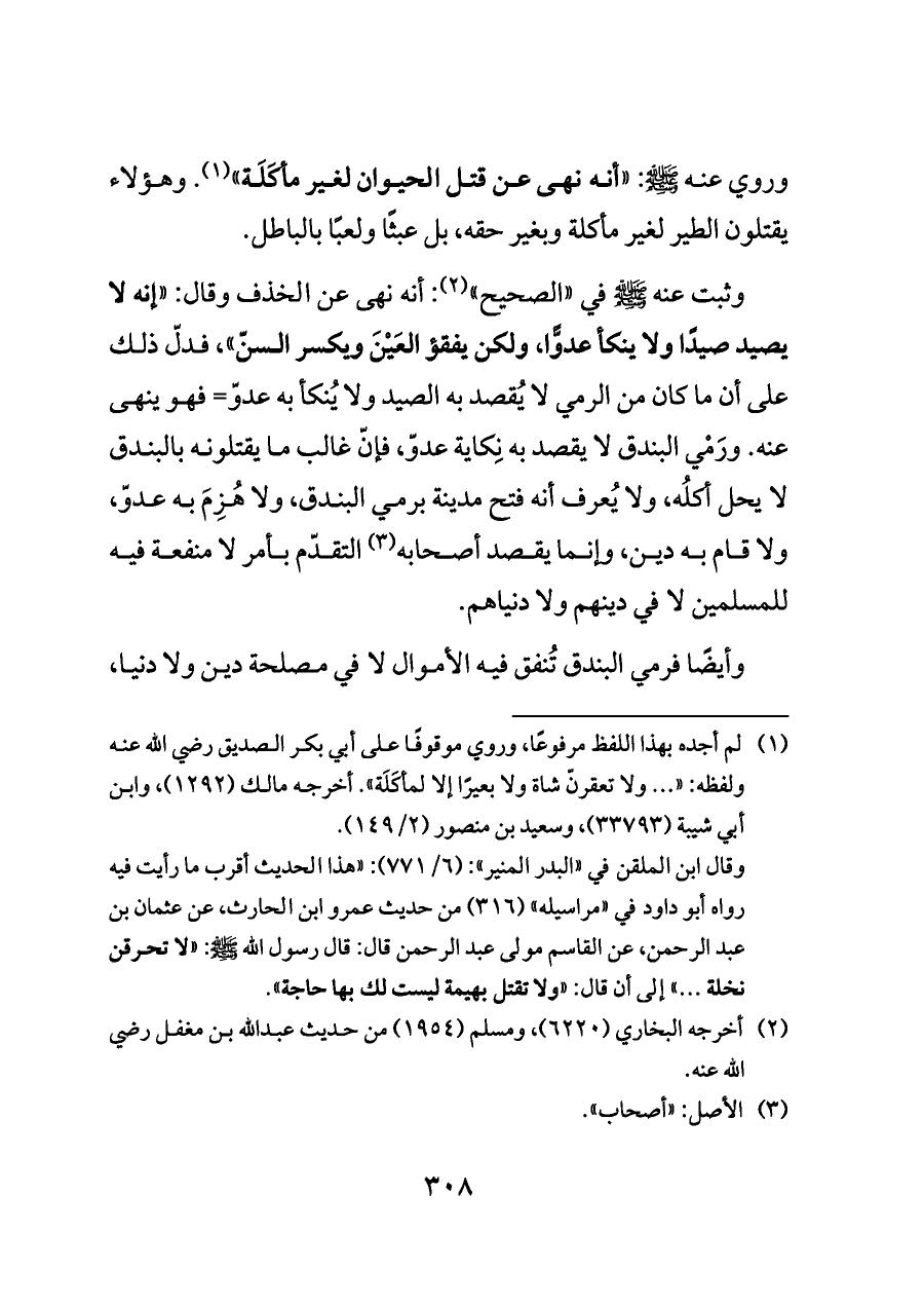 وروي عنه - صلى الله عليه وسلم -: «أنه نهى عن قتل الحيوان لغير مأكَلَة» (¬١).