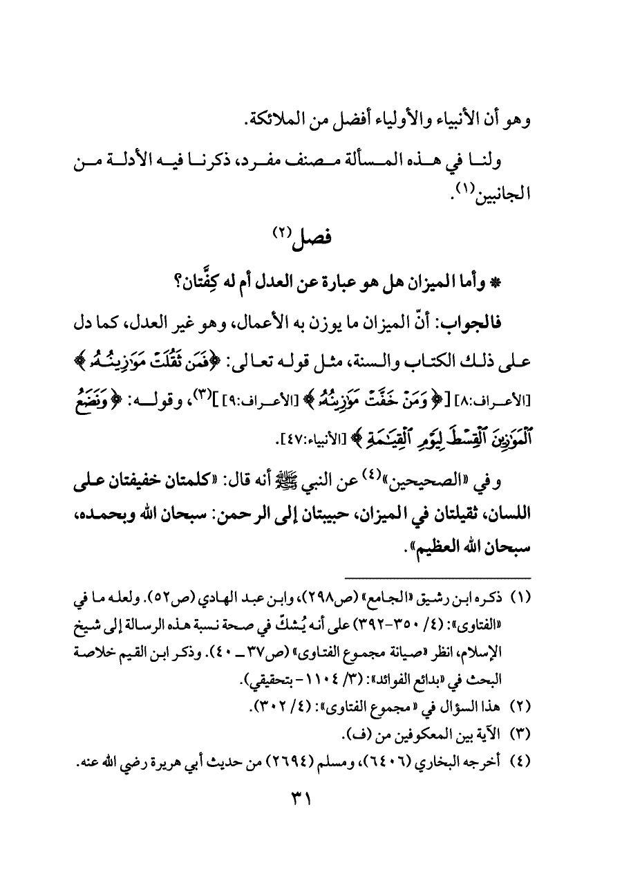 فالجواب: أنّ الميزان ما يوزن به الأعمال، وهو غير العدل، كما دل على ذلك الكتاب والسنة، مثل قوله تعالى: {فَمَنْ ثَقُلَتْ مَوَازِينُهُ} [الأعراف:٨] [{وَمَنْ خَفَّتْ مَوَازِينُهُ} [الأعراف:٩]] (¬٣)، وقوله: {وَنَضَعُ الْمَوَازِينَ الْقِسْطَ لِيَوْمِ الْقِيَامَةِ} [الأنبياء:٤٧].