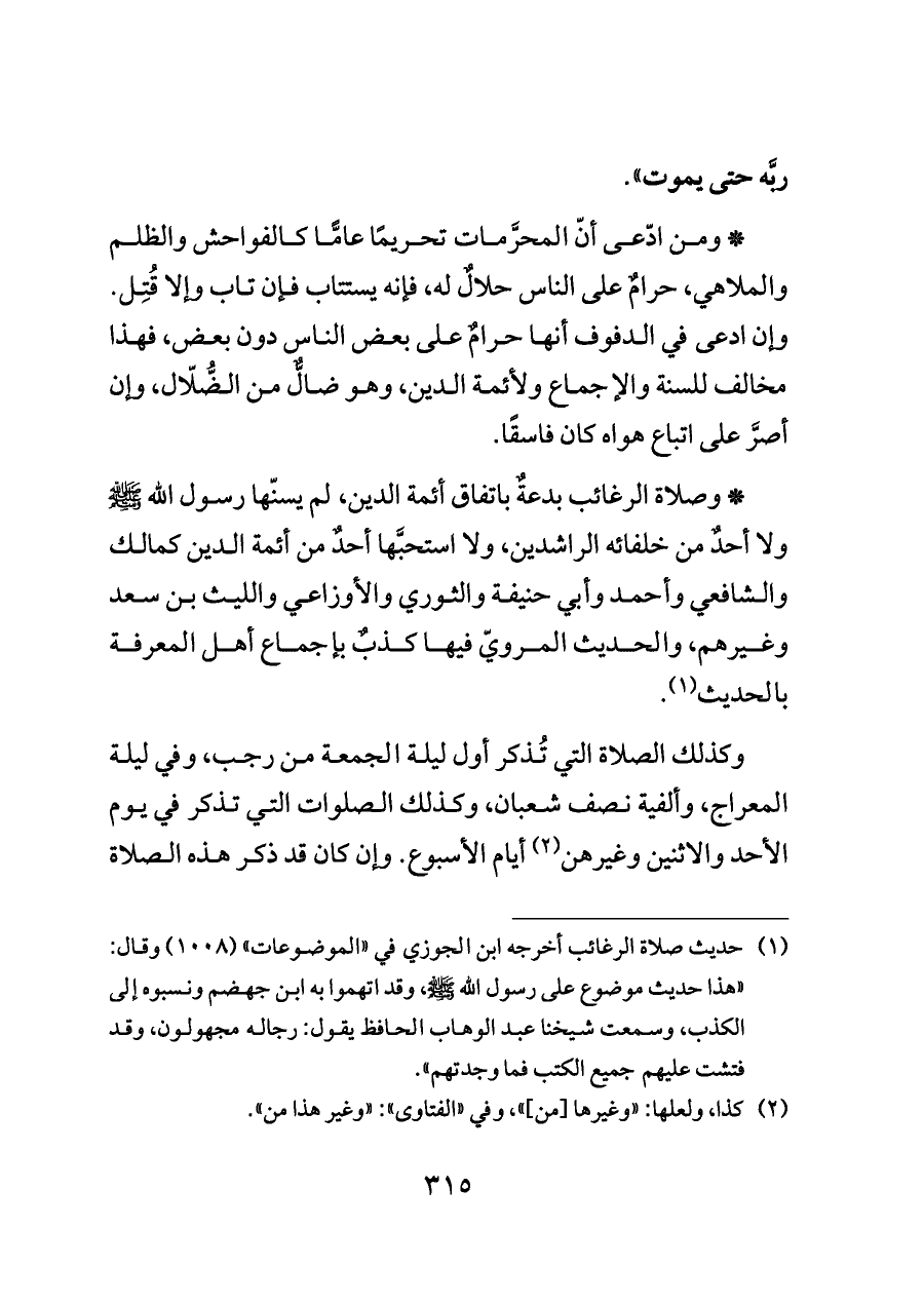 (¬١) حديث صلاة الرغائب أخرجه ابن الجوزي في «الموضوعات» (١٠٠٨) وقال: «هذا حديث موضوع على رسول الله - صلى الله عليه وسلم -، وقد اتهموا به ابن جهضم ونسبوه إلى الكذب، وسمعت شيخنا عبد الوهاب الحافظ يقول: رجاله مجهولون، وقد فتشت عليهم جميع الكتب فما وجدتهم».