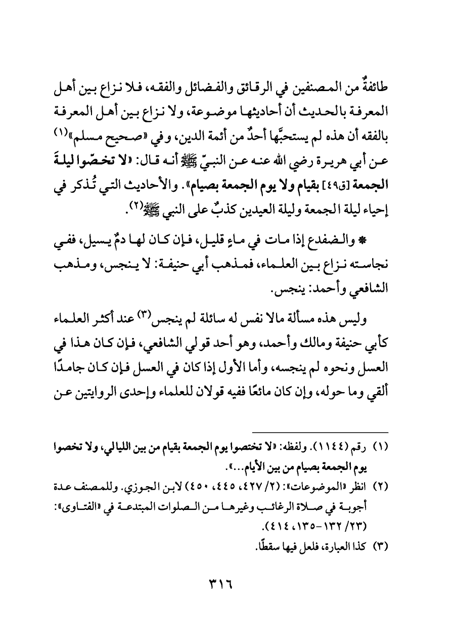 طائفةٌ من المصنفين في الرقائق والفضائل والفقه، فلا نزاع بين أهل المعرفة بالحديث أن أحاديثها موضوعة، ولا نزاع بين أهل المعرفة بالفقه أن هذه لم يستحبَّها أحدٌ من أئمة الدين، وفي «صحيح مسلم» (¬١) عن أبي هريرة رضي الله عنه عن النبيّ - صلى الله عليه وسلم - أنه قال: «لا تخصّوا ليلةَ الجمعة [ق ٤٩] بقيام ولا يوم الجمعة بصيام». والأحاديث التي تُذكر في إحياء ليلة الجمعة وليلة العيدين كذبٌ على النبي - صلى الله عليه وسلم - (¬٢).